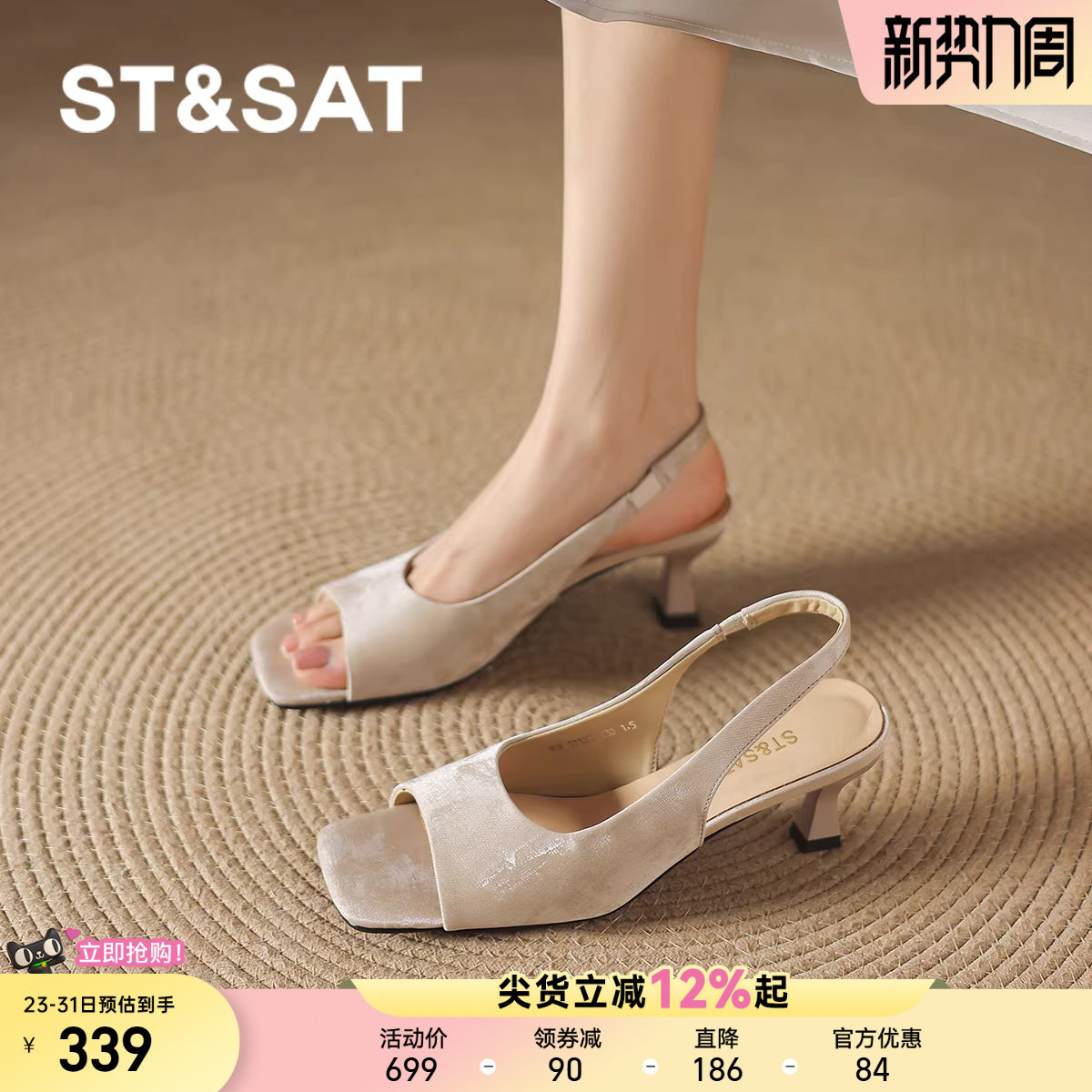 星期六方头鱼嘴凉鞋女款2026年新款春夏一字带法式后空露趾高跟鞋