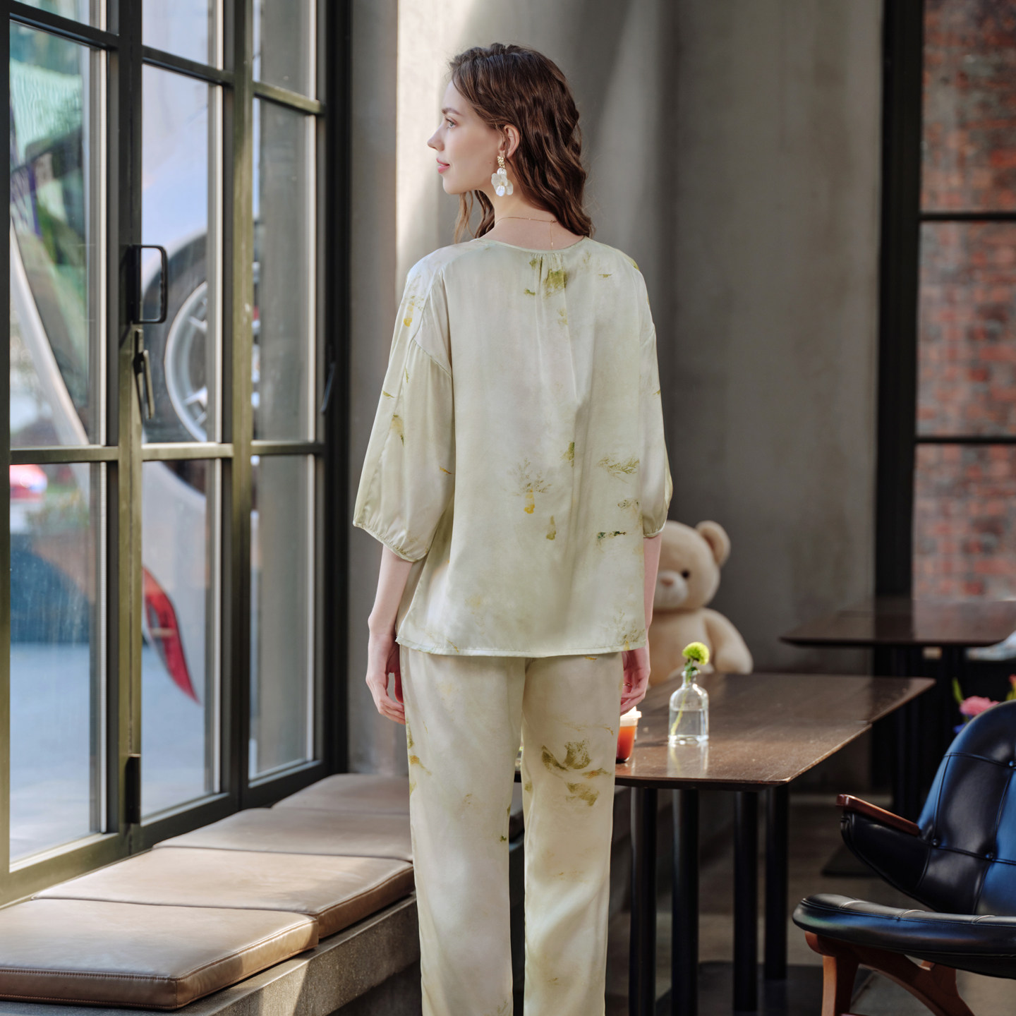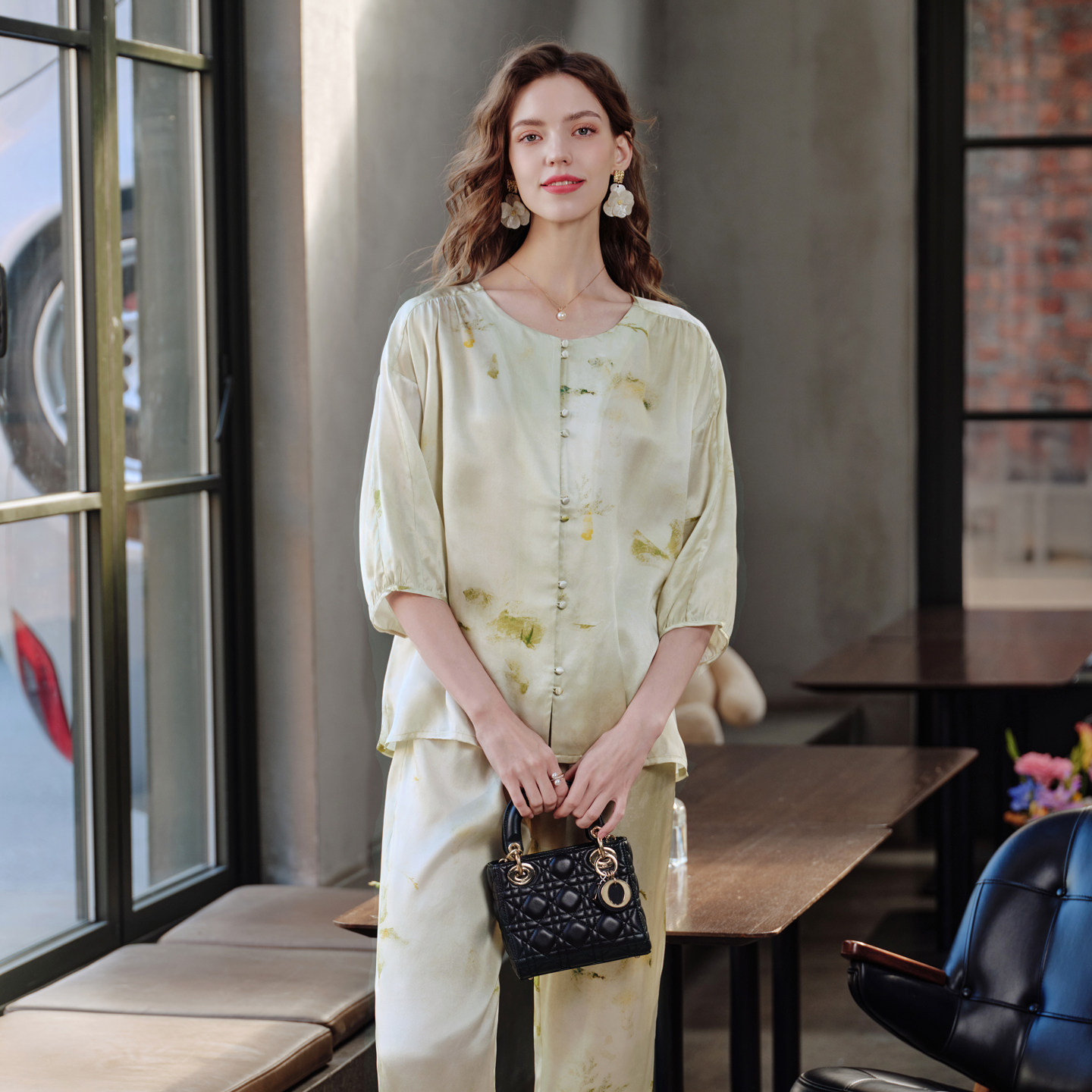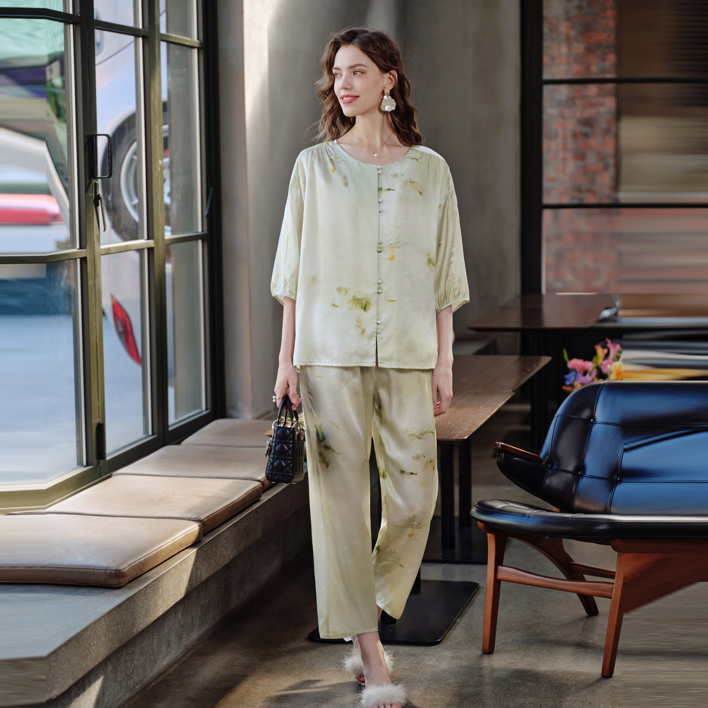 美标七分袖真丝睡衣套装女春夏季6A级100%桑蚕丝中国风丝绸家居服