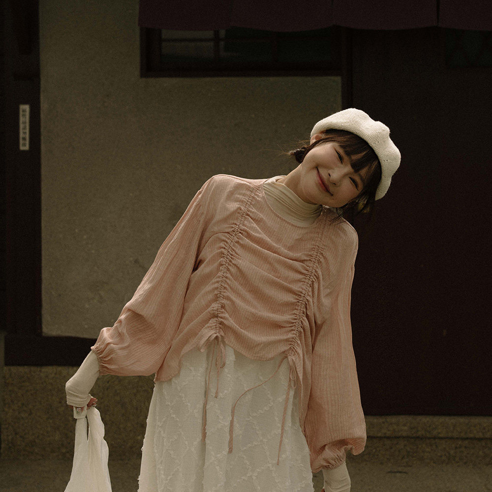 QUEENSHOP 2025秋冬新品女装质感纹理双抽皱绑带澎袖上衣01099215