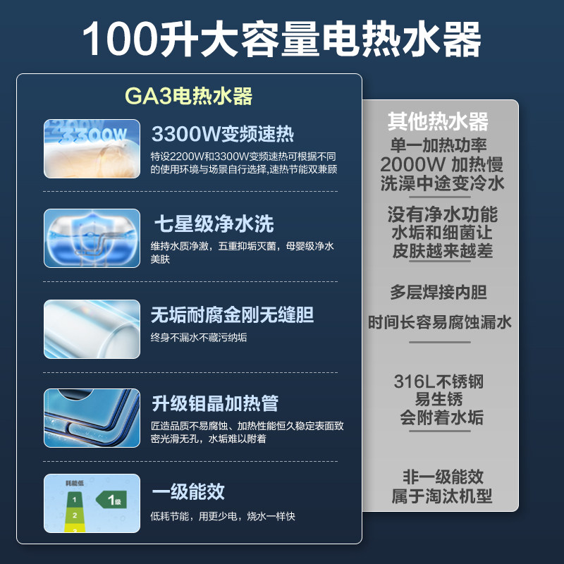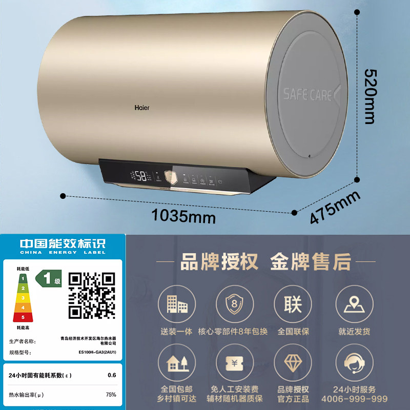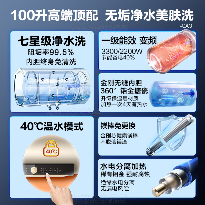 国补海尔电热水器100L大容量家用变频80升储水式浴室洗澡一级能效