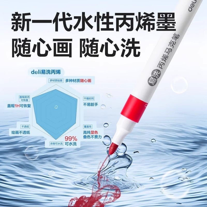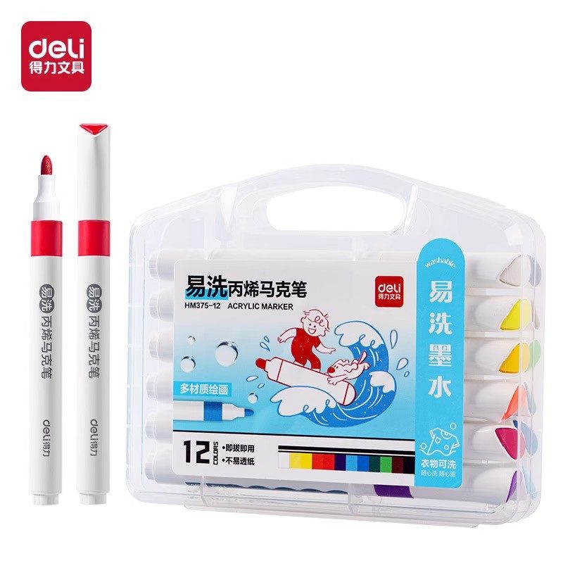 得力圆杆丙烯马克笔可水洗升级颜料叠色易覆盖安全任意涂小学生专用画笔彩笔儿童美术套装幼儿园绘画涂鸦