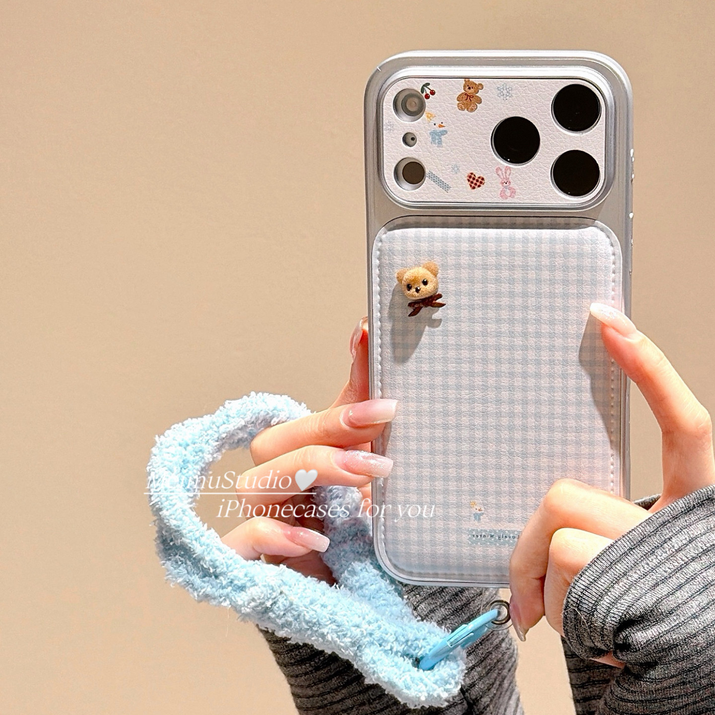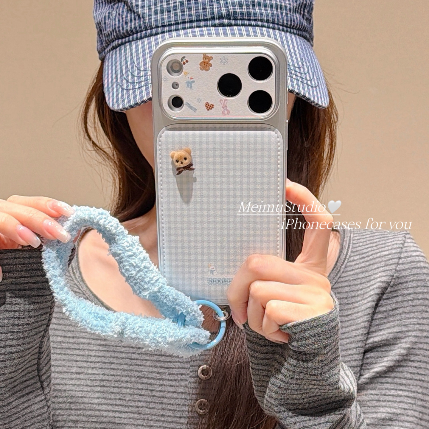 美牧日韩蓝色格纹立体小熊适用iphone17手机壳苹果16promax新款15带挂绳17pro女14pm可爱15pro电镀皮质16全包