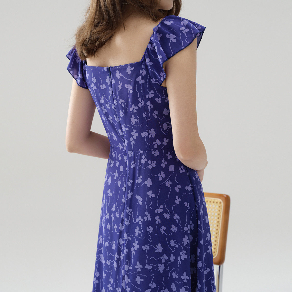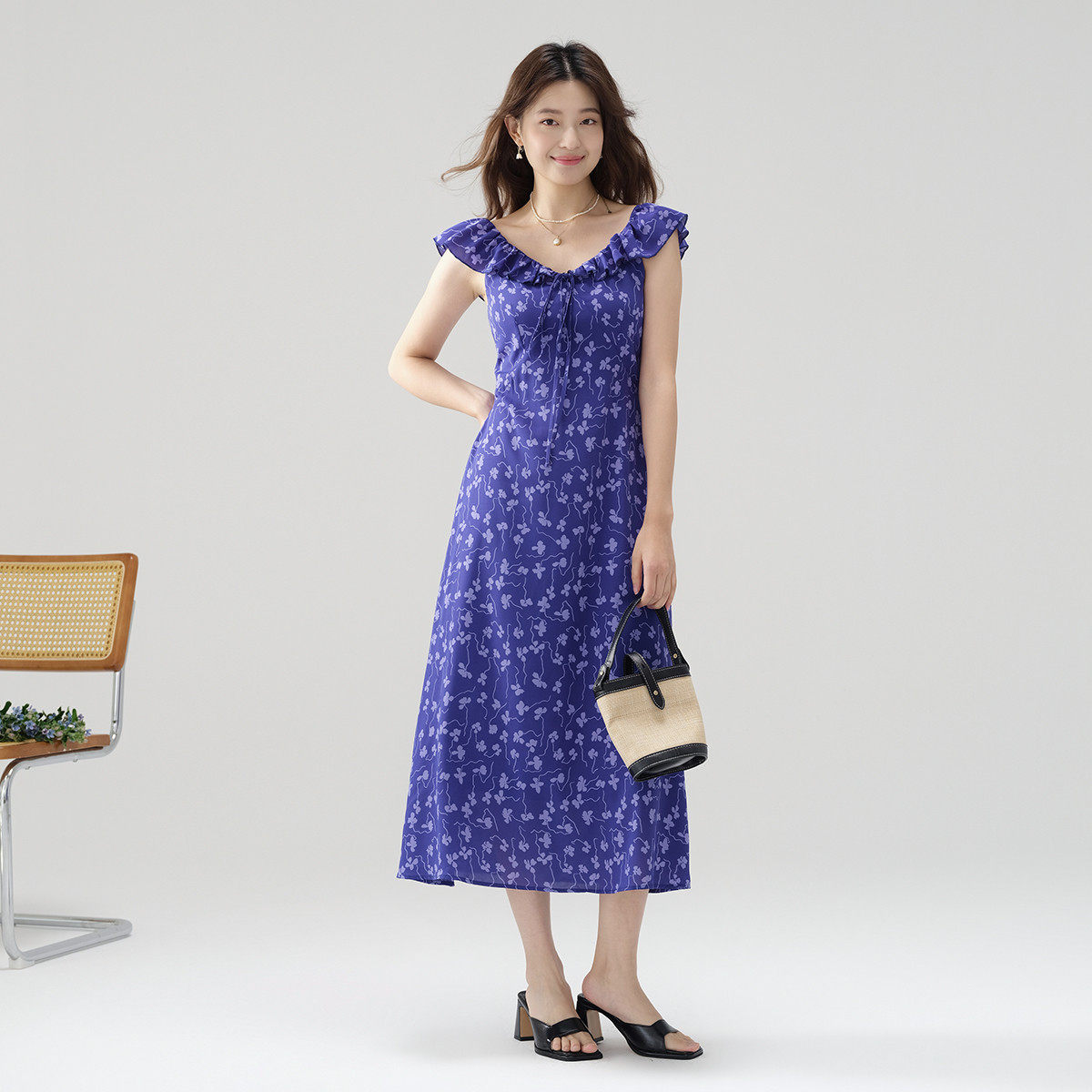 雨菲2025夏新款碎花v领飞飞边清冷大美人设计感显瘦斜裁连衣裙女