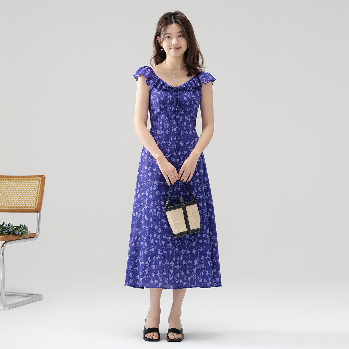 one more法式荷叶边V领碎花连衣裙女2025新款夏季收腰显瘦长裙子