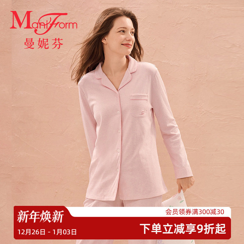 曼妮芬女士睡衣睡裤翻领开襟长袖长裤套装舒适家居服女生起居服