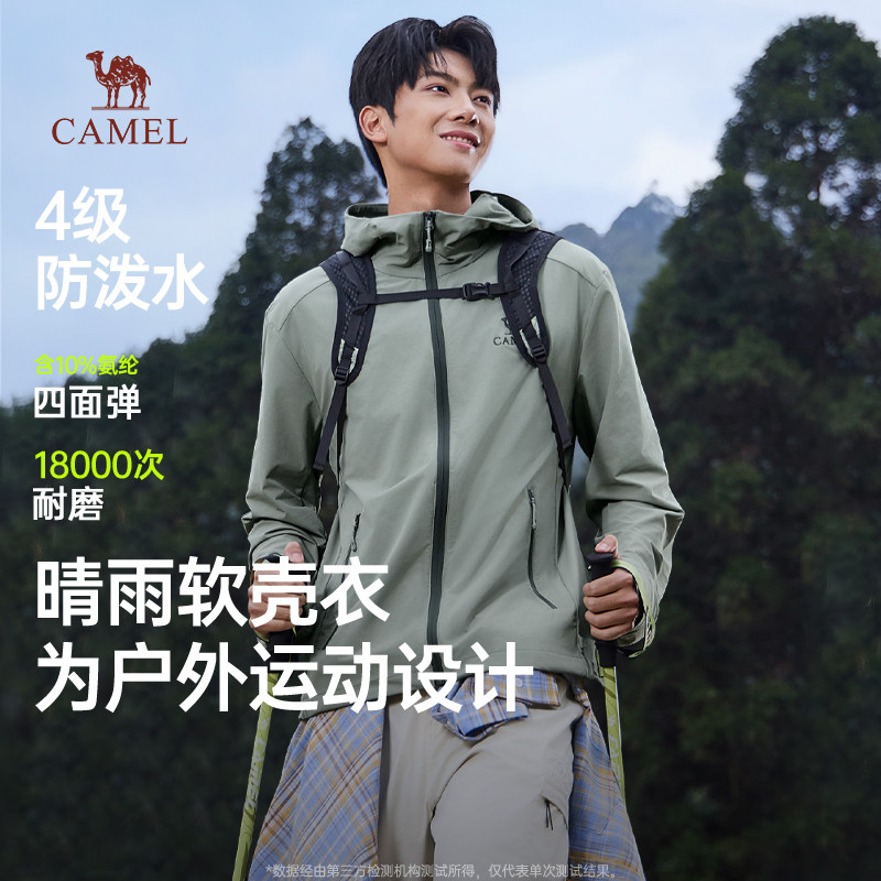 骆驼男装透气软壳衣夹克情侣款防风防泼水夹克户外带帽运动外套女