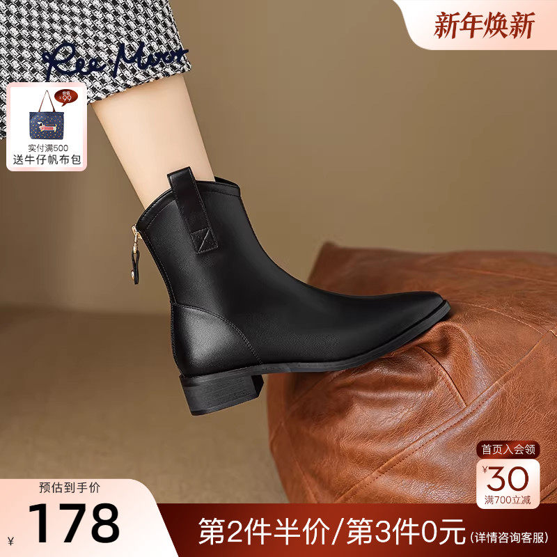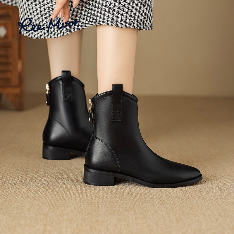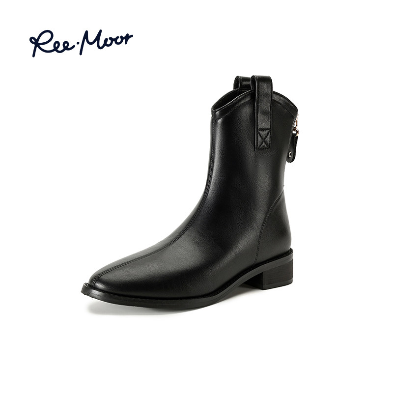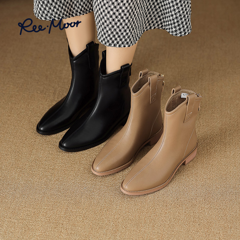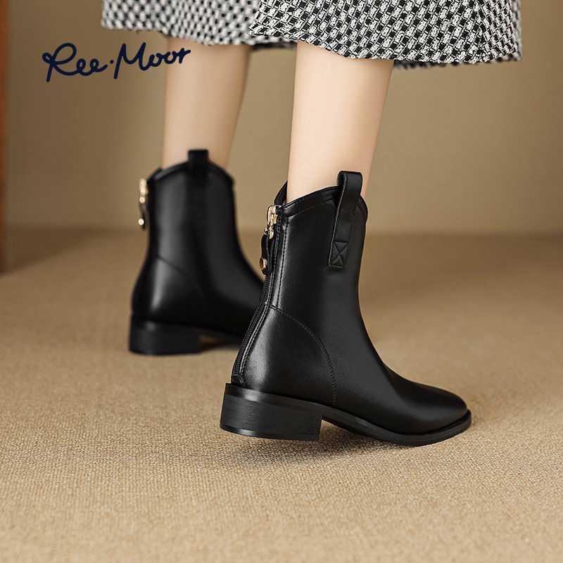 REEMOOR睿慕秋冬新款尖头时装靴子厚底粗跟显瘦短靴单靴女鞋