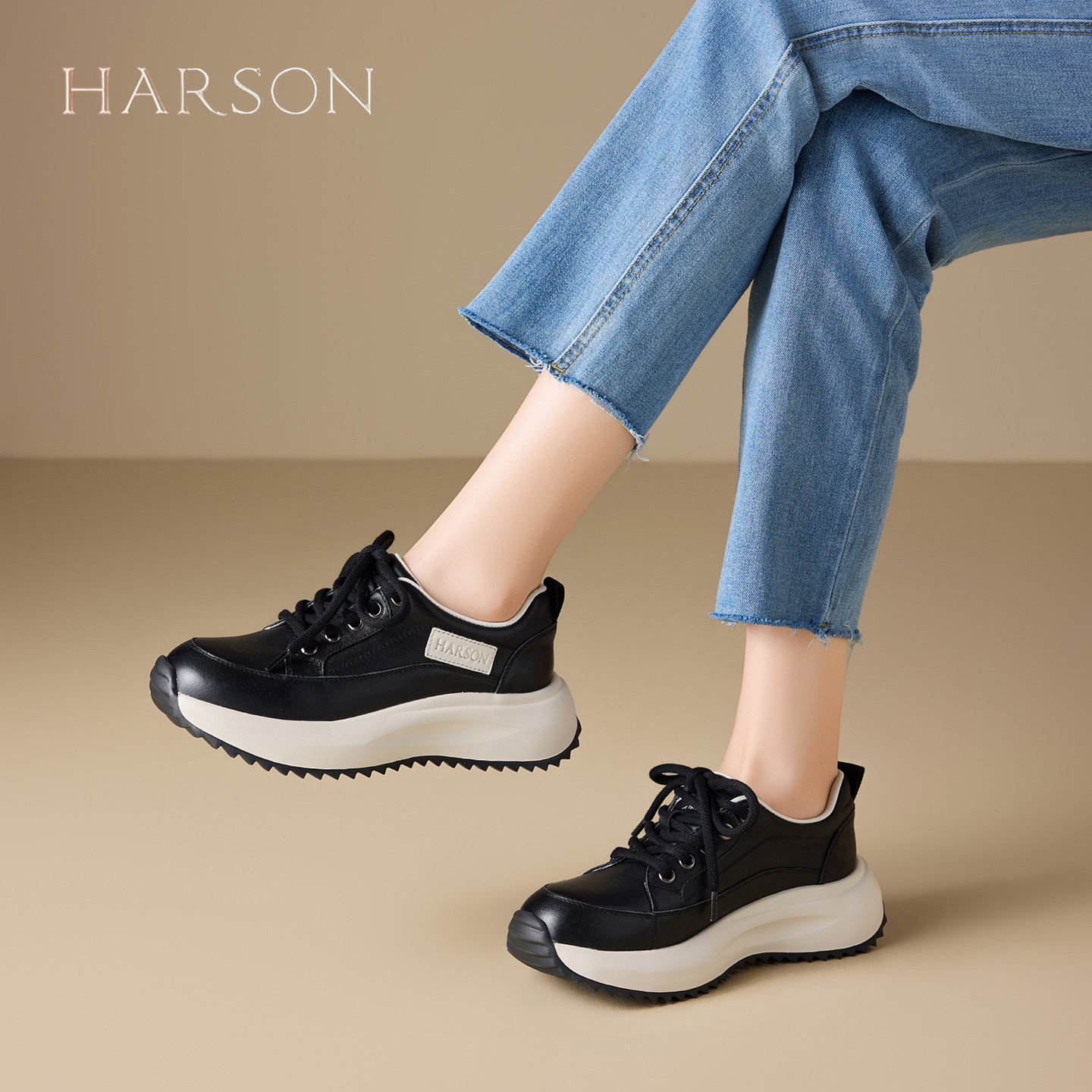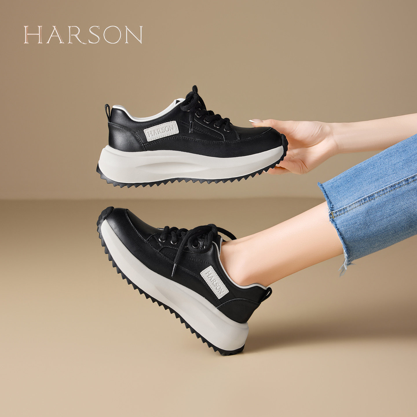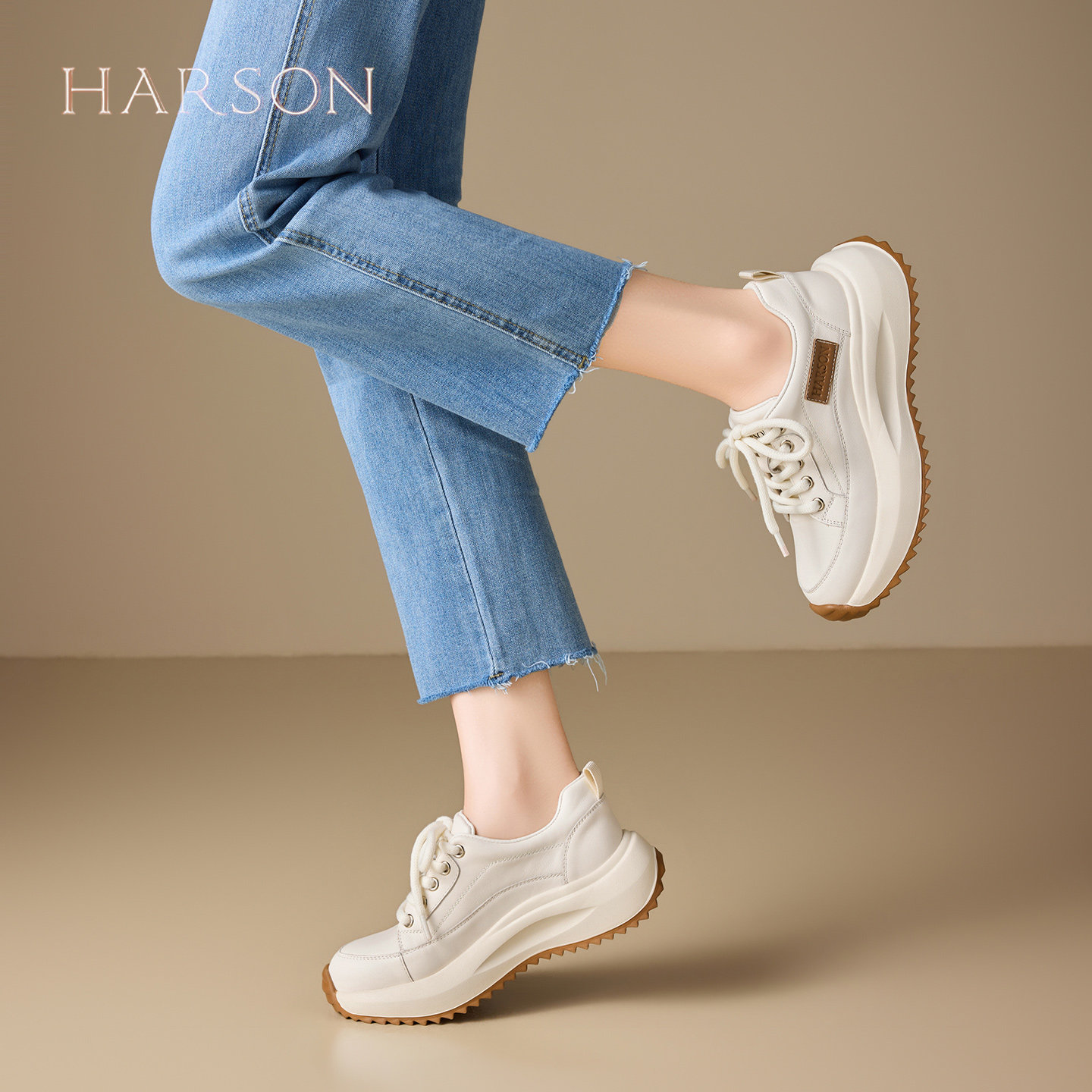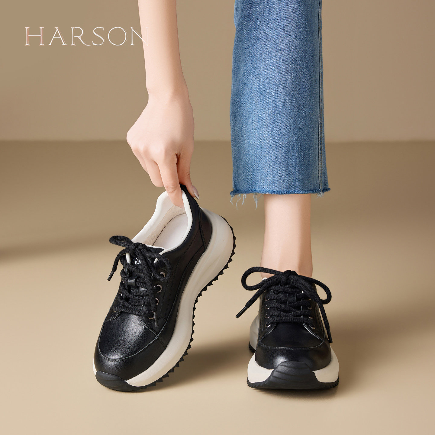 哈森头层牛皮复古厚底休闲鞋女2026春季新款爆款舒适软底运动鞋
