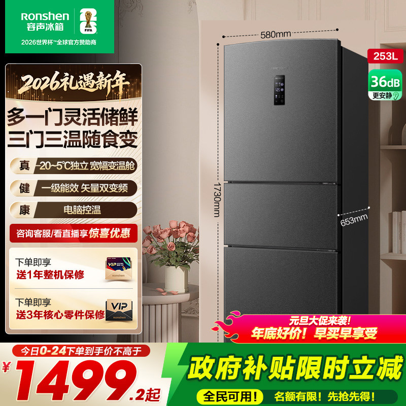 容声253L三开门变频风冷无霜一级节能家用超薄小型租房宿舍电冰箱