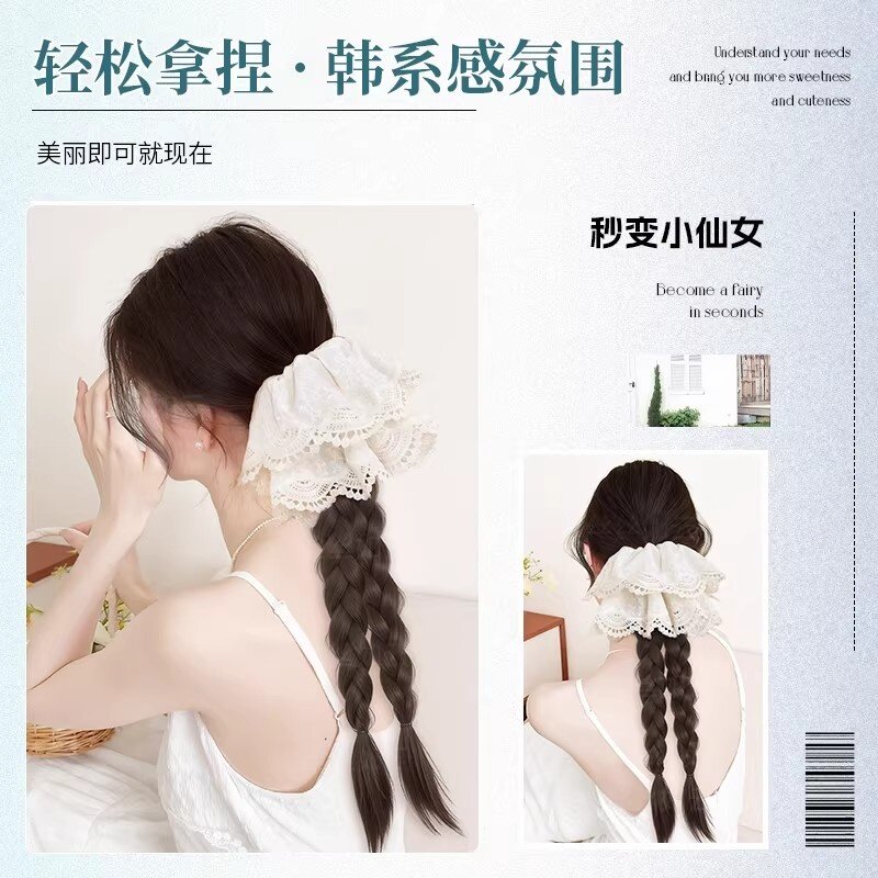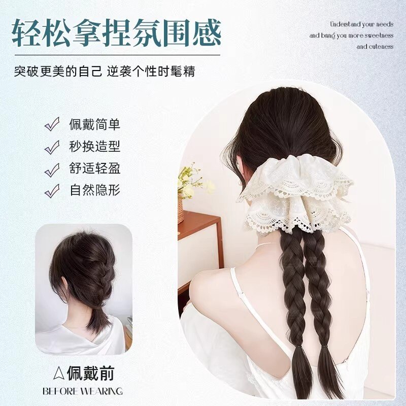 假发辫子女新中式抓夹低马尾蕾丝发饰双麻花长辫彷真发假发辫造型