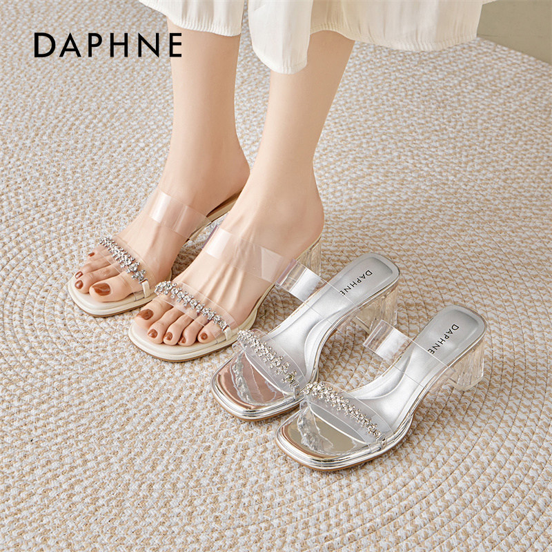 达芙妮银色凉鞋女2026春夏新款水钻露趾一字拖鞋子透明水晶高跟鞋
