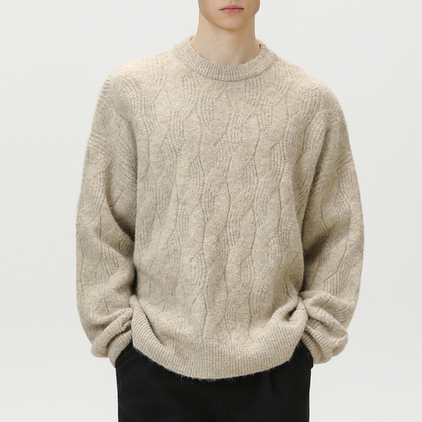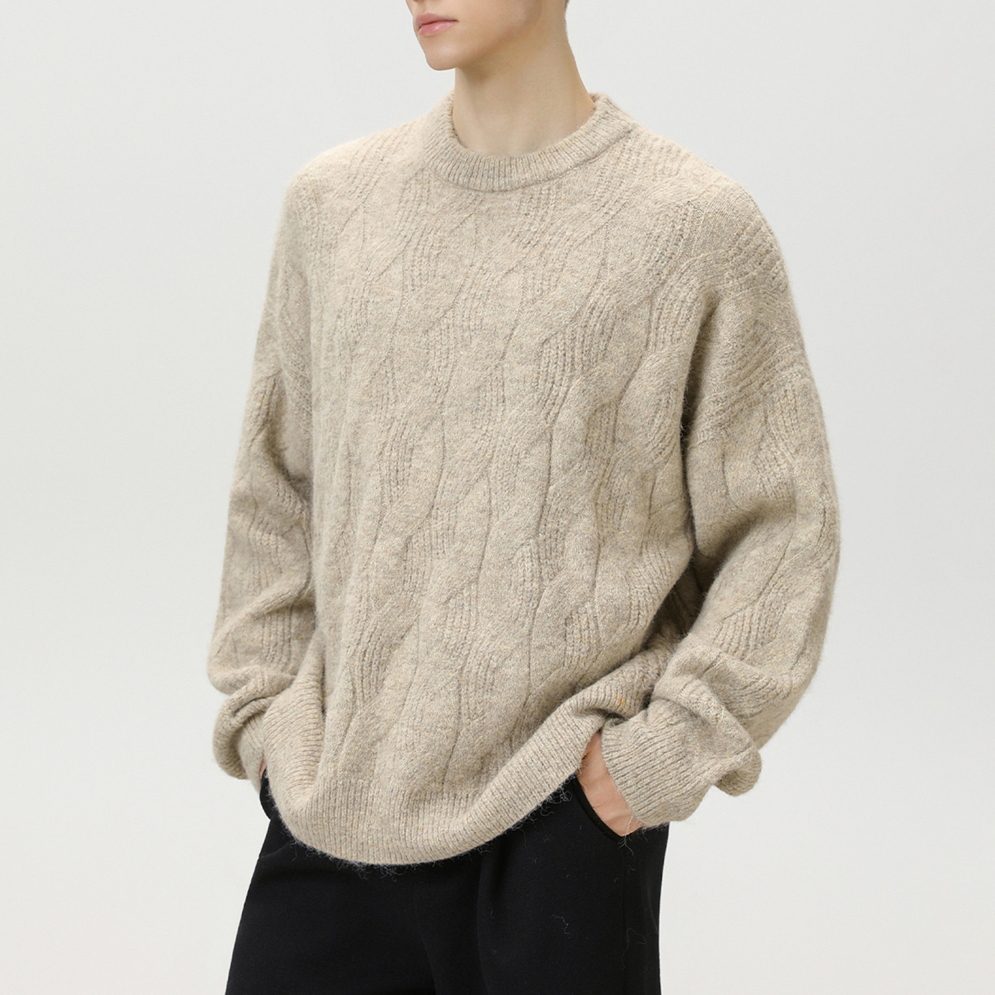 男士马海毛针织衫男2025新款麻花毛衣燕麦色圆领纯色羊毛上衣冬装