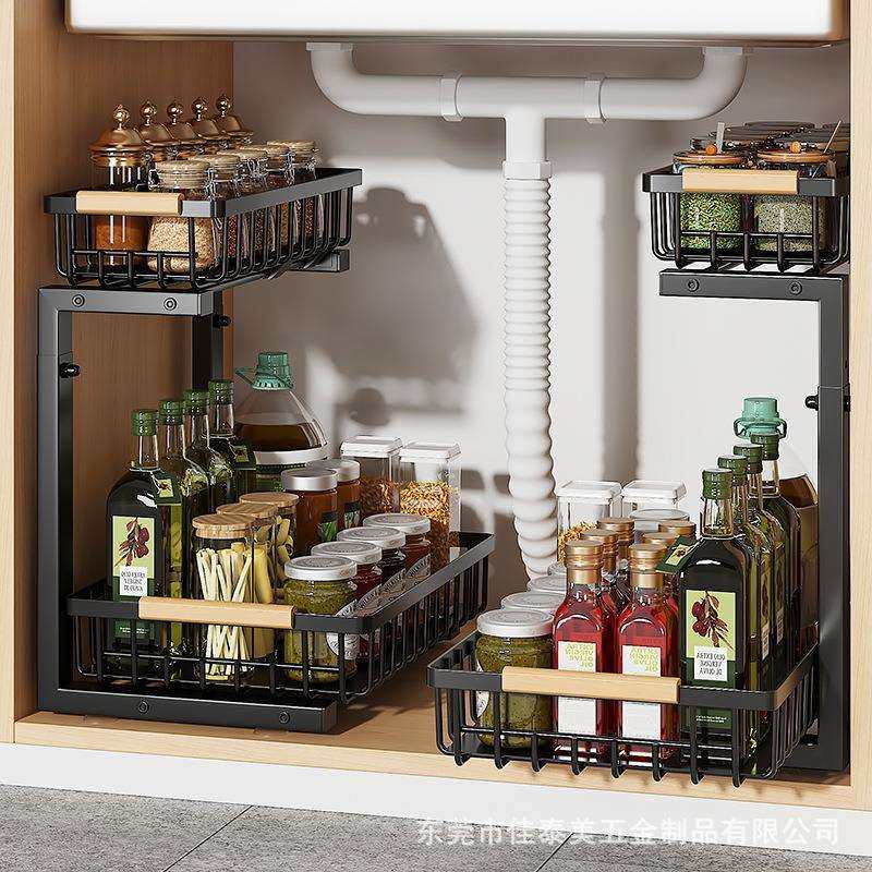 厨房水槽下置物架落地可调节橱柜下水槽拉篮家用台面调味用品收纳
