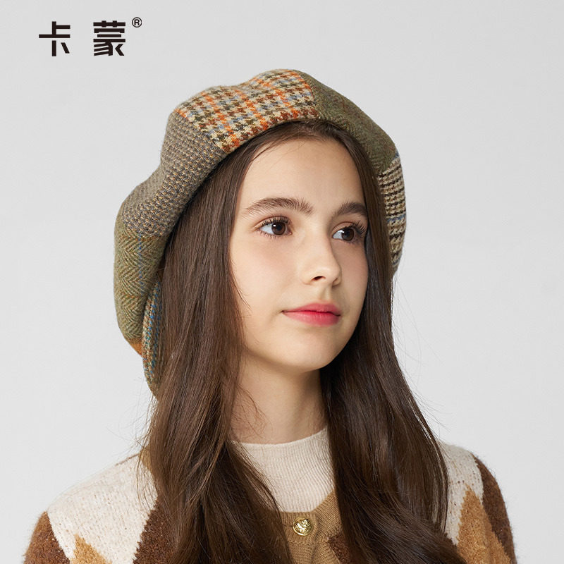 卡蒙绵羊毛呢拼接反戴格子贝雷帽女加绒保暖八角前进帽鸭舌显脸小