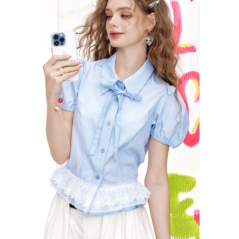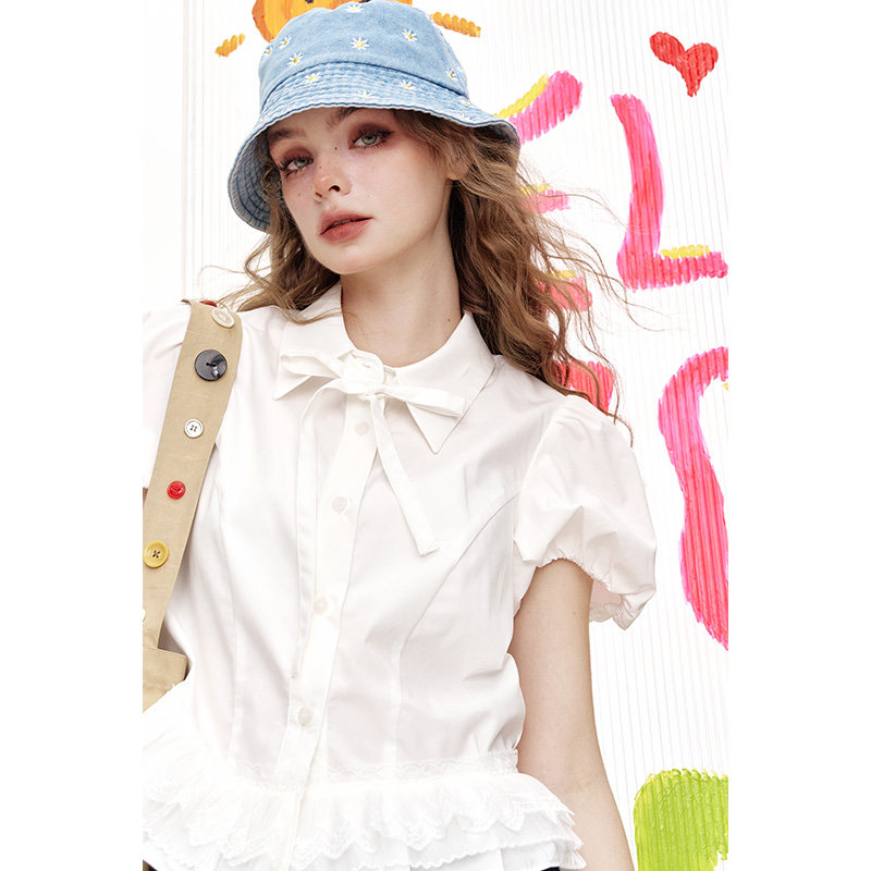 妖精的口袋泡泡袖蕾丝拼接短袖衬衫女2025夏季新款莱赛尔甜美上衣