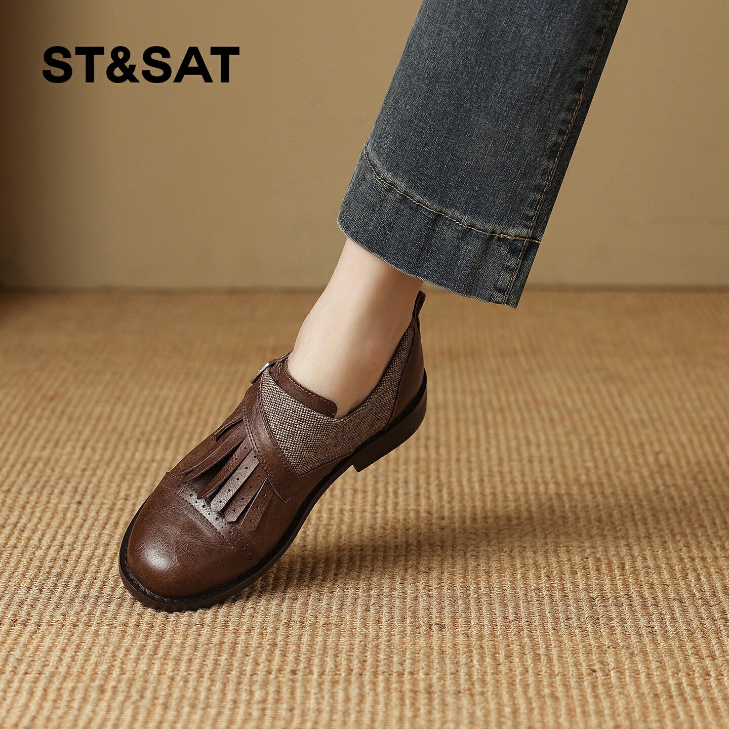 星期六英伦风布洛克鞋女2026春季流苏皮带扣乐福鞋百搭粗跟小皮鞋