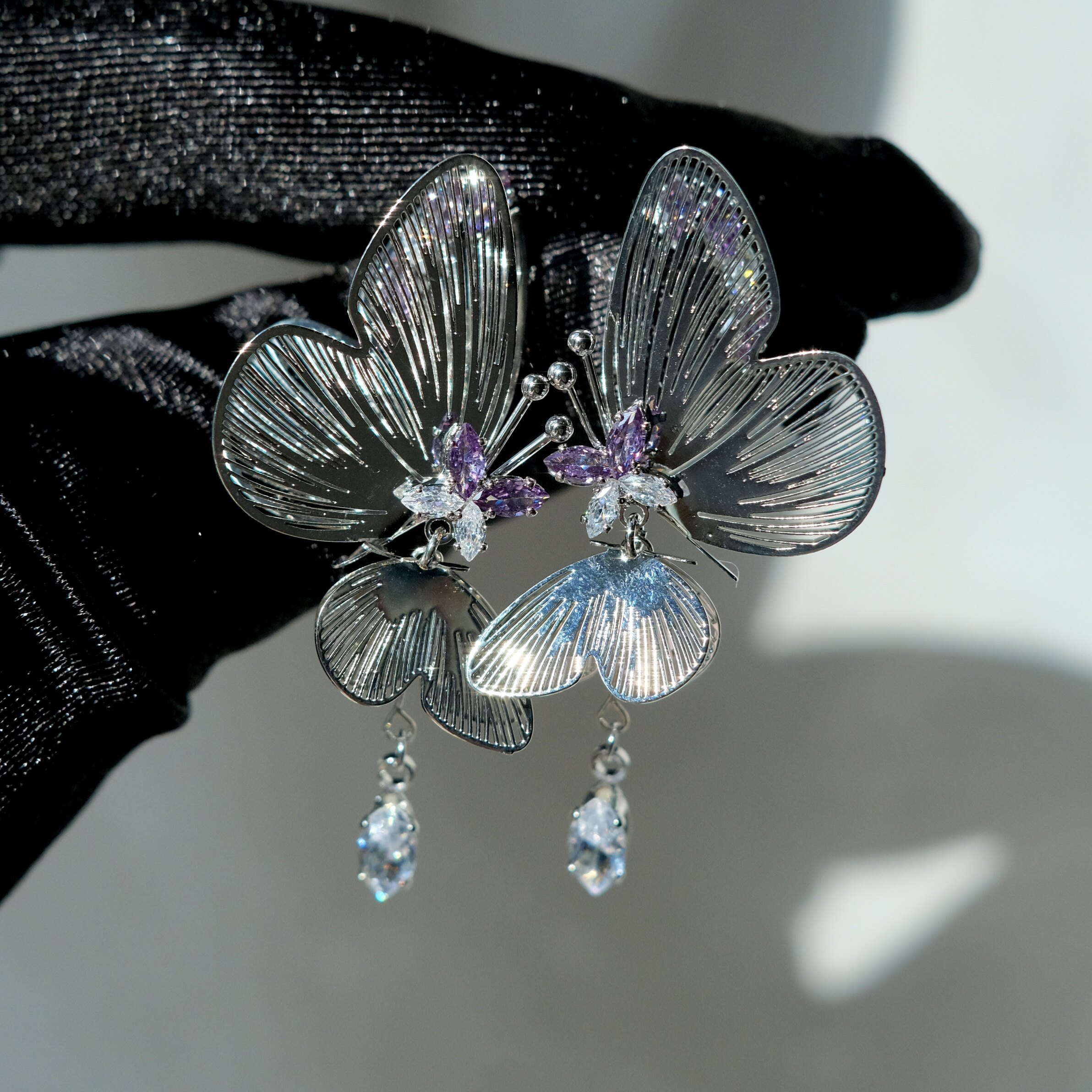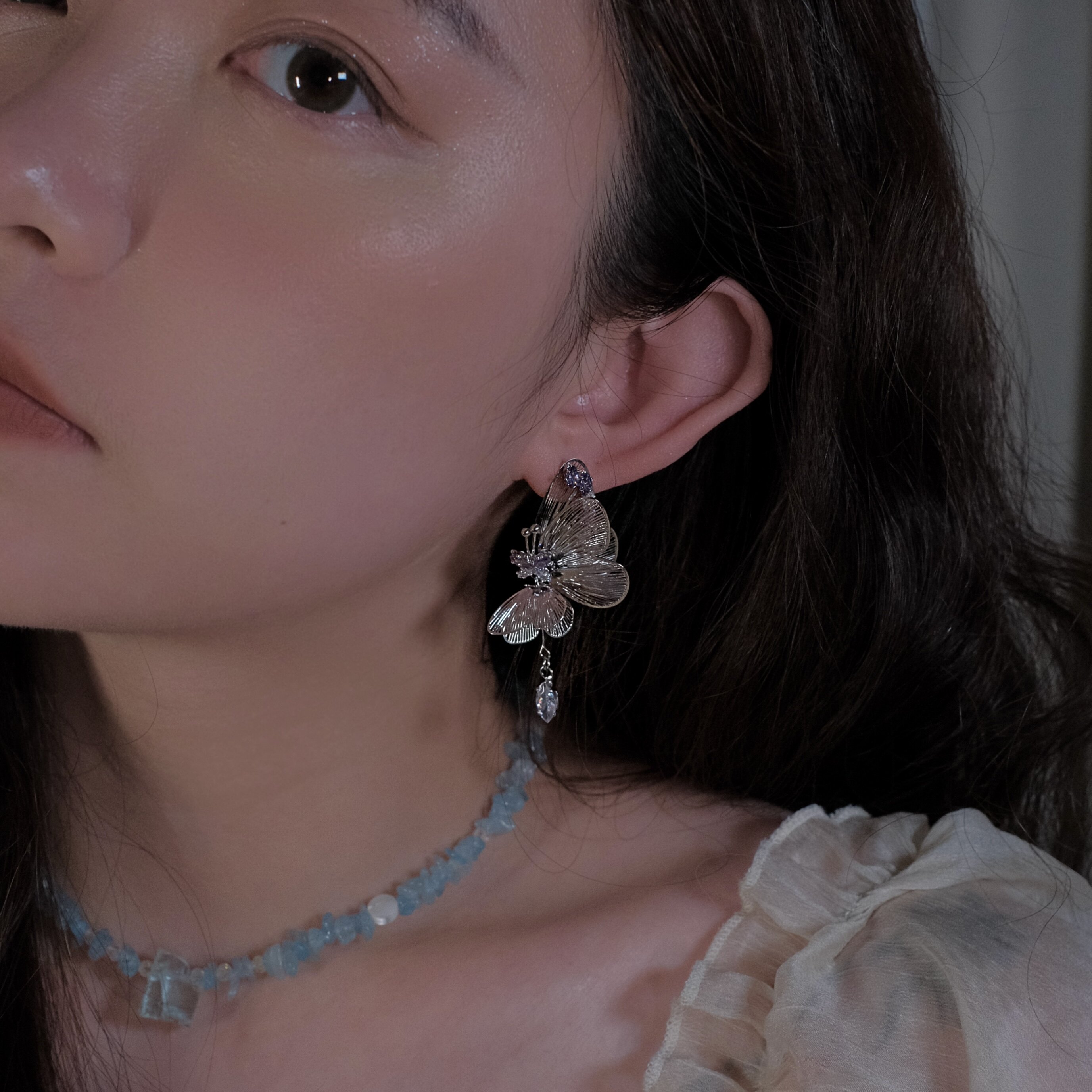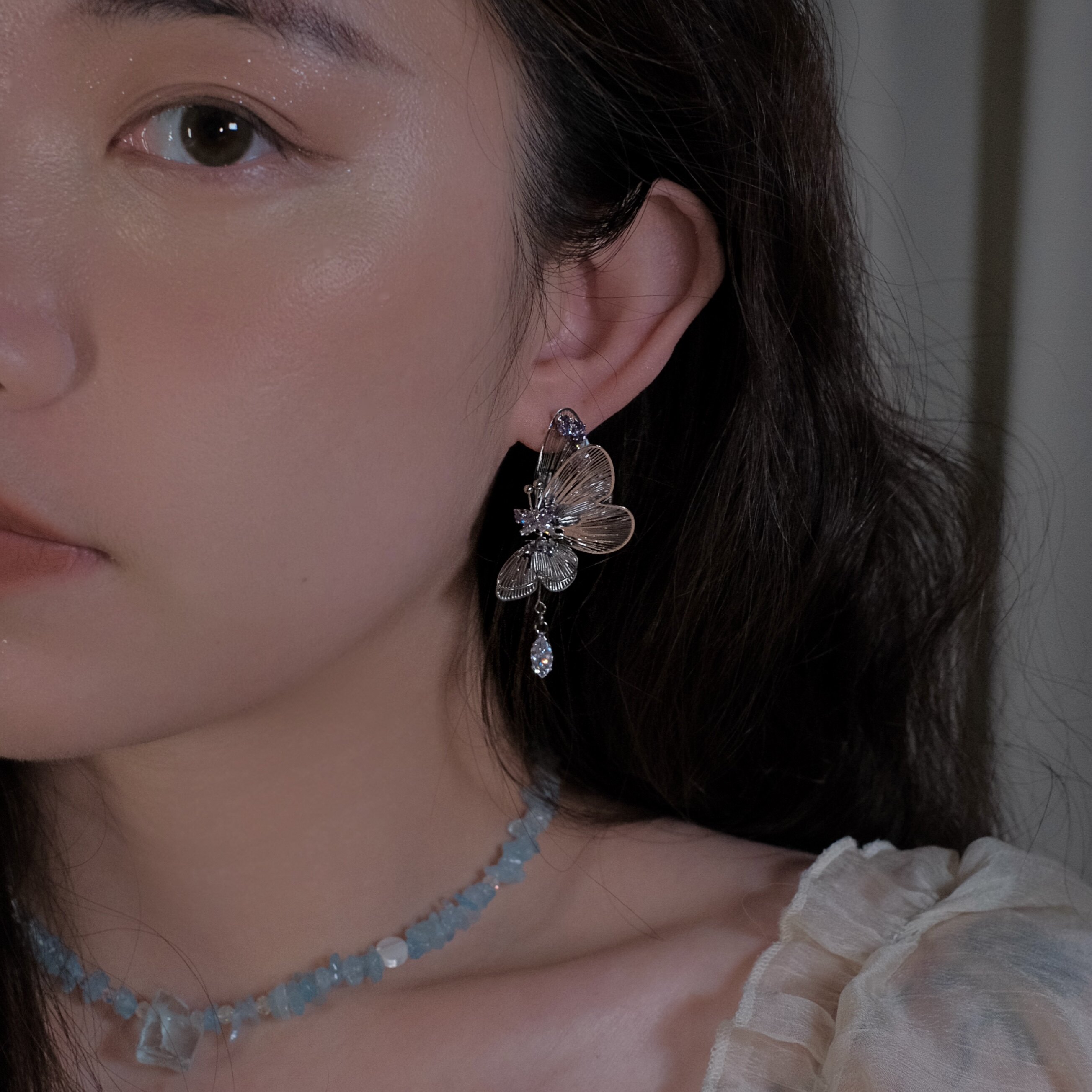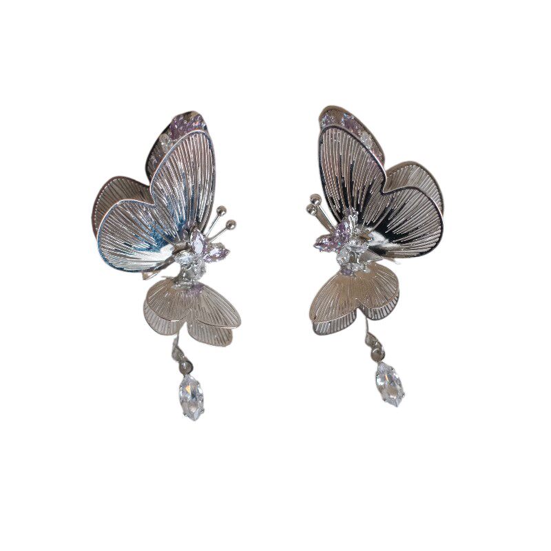 《蝴蝶精灵》灵动立体复古夸张小众银色镂空长款锆石耳钉耳环耳夹