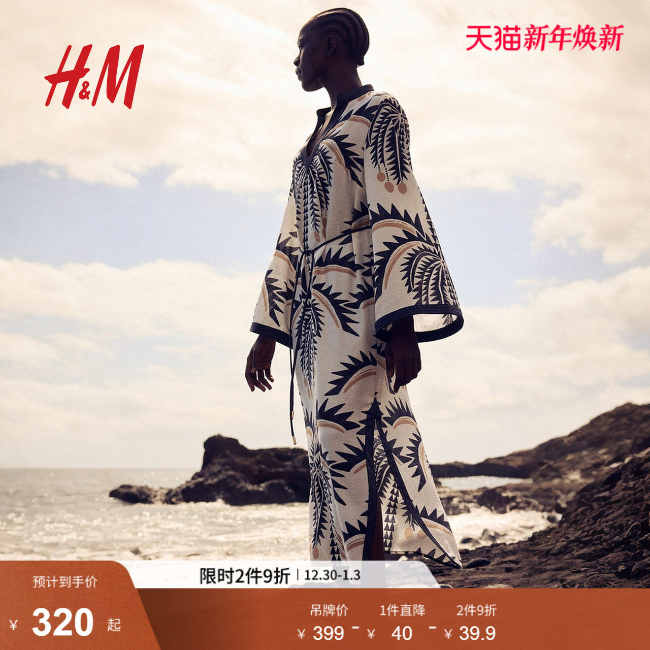 HM女装连衣裙2025冬季新款腰部系带裙衫式植物印花长裙1289486