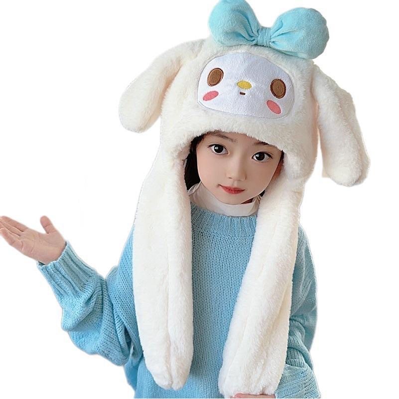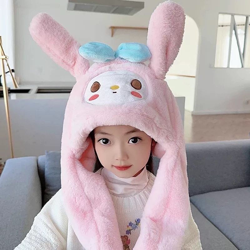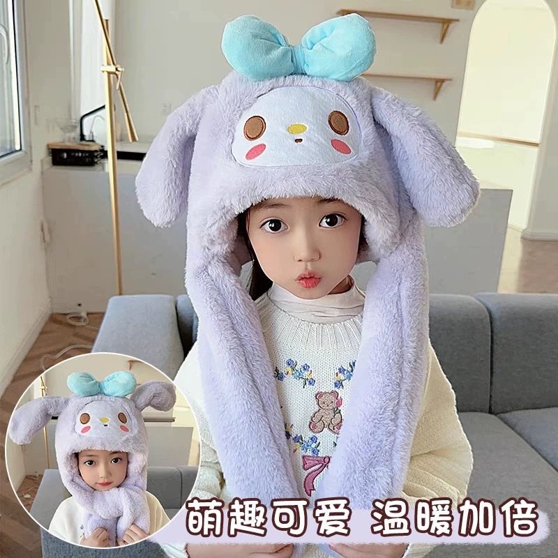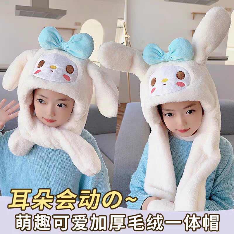 儿童耳朵会动帽子兔耳帽加厚毛绒帽男女宝宝围巾一体帽冬美乐蒂