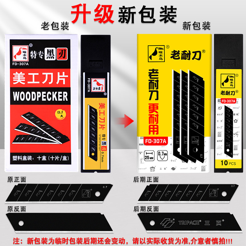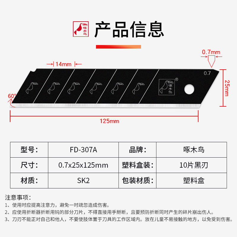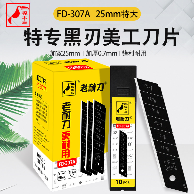 啄木鸟307A特大号美工刀刀片25MM全黑钢加厚工业级壁纸刀介刀替刃