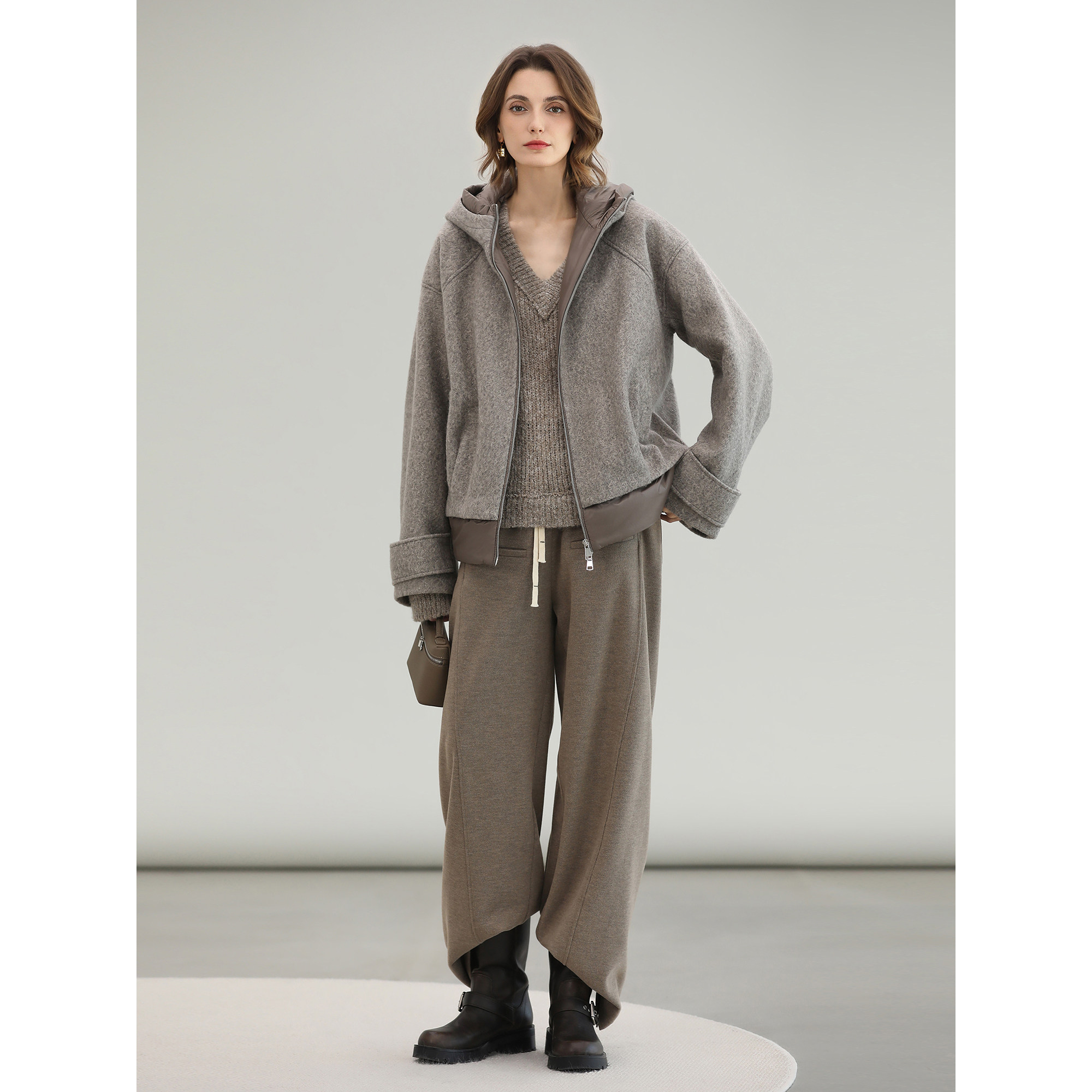 COCOBELLA假两件连帽毛呢外套冬仿水波纹短款呢子大衣WL3205