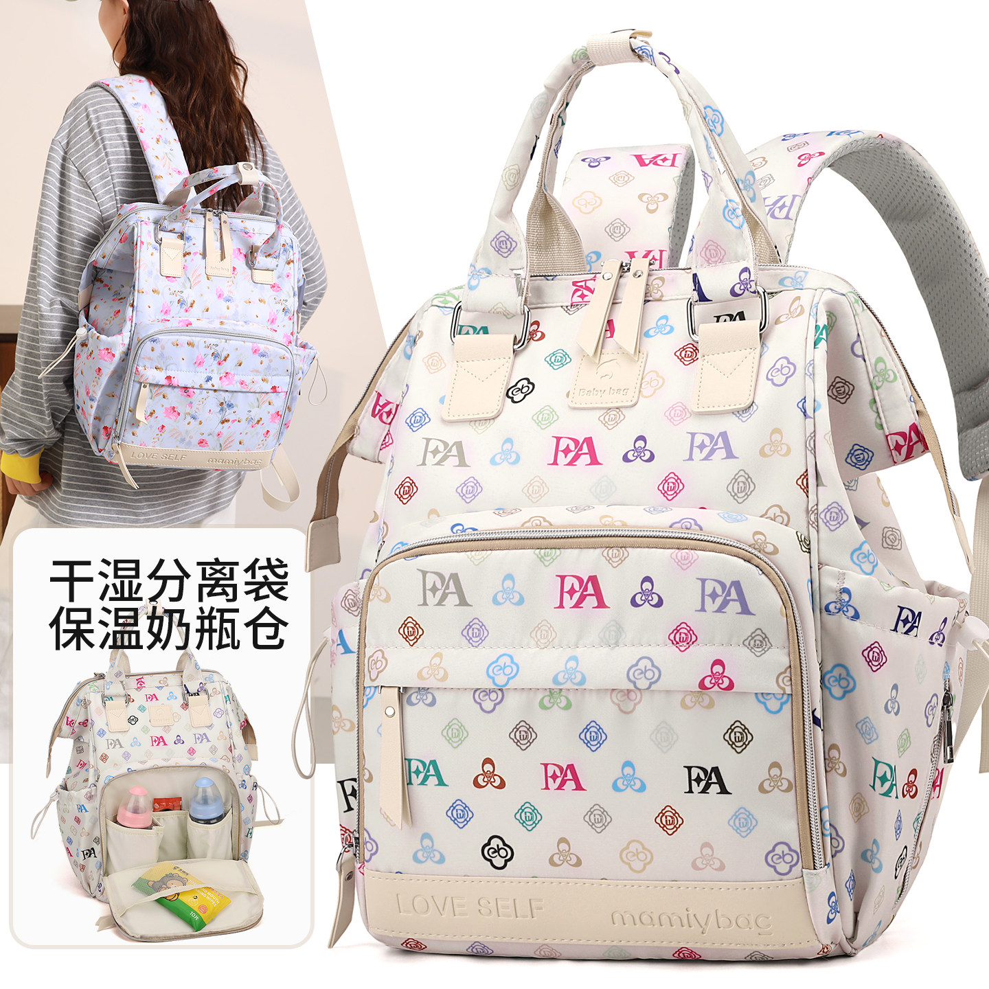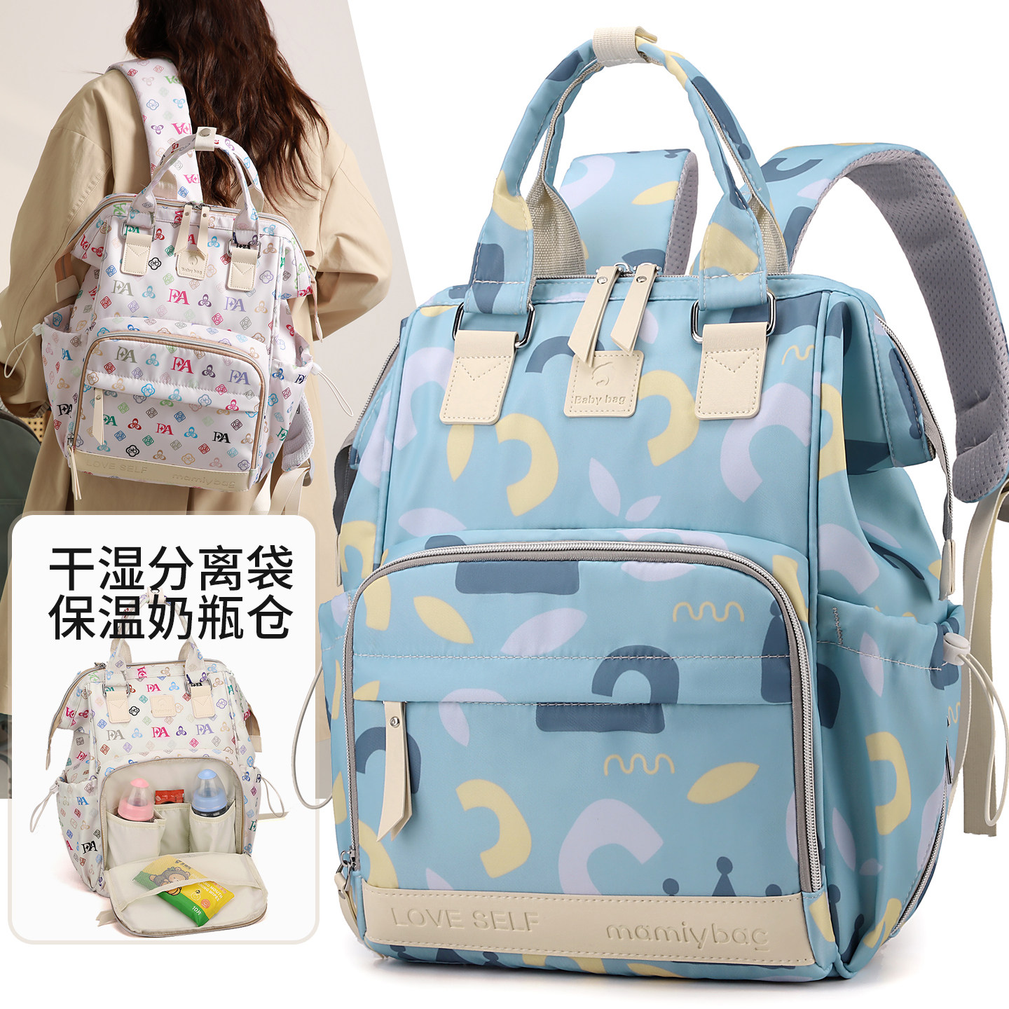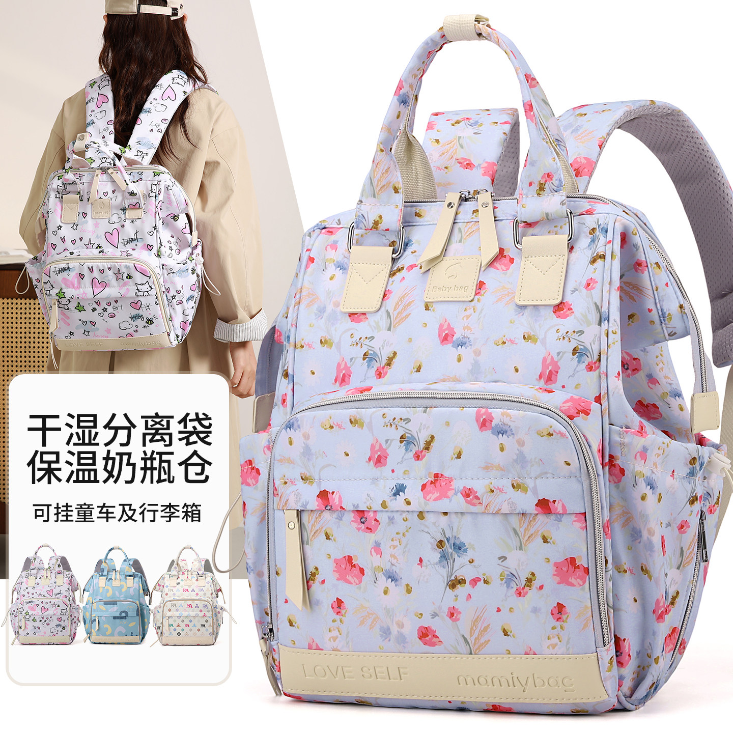 婧麒多功能妈咪包双肩背包大容量母婴包干湿分离保温奶瓶轻便外出