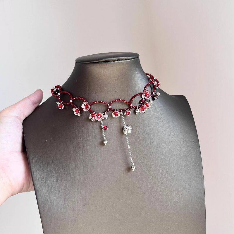 炽热火焰!复古红色串珠银色花朵项链女款设计感锁骨链choker颈链