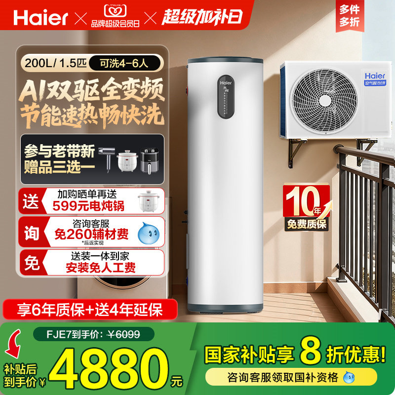 海尔小红花套系空气能热水器家用200升变频超一级FJE7节能F5E7