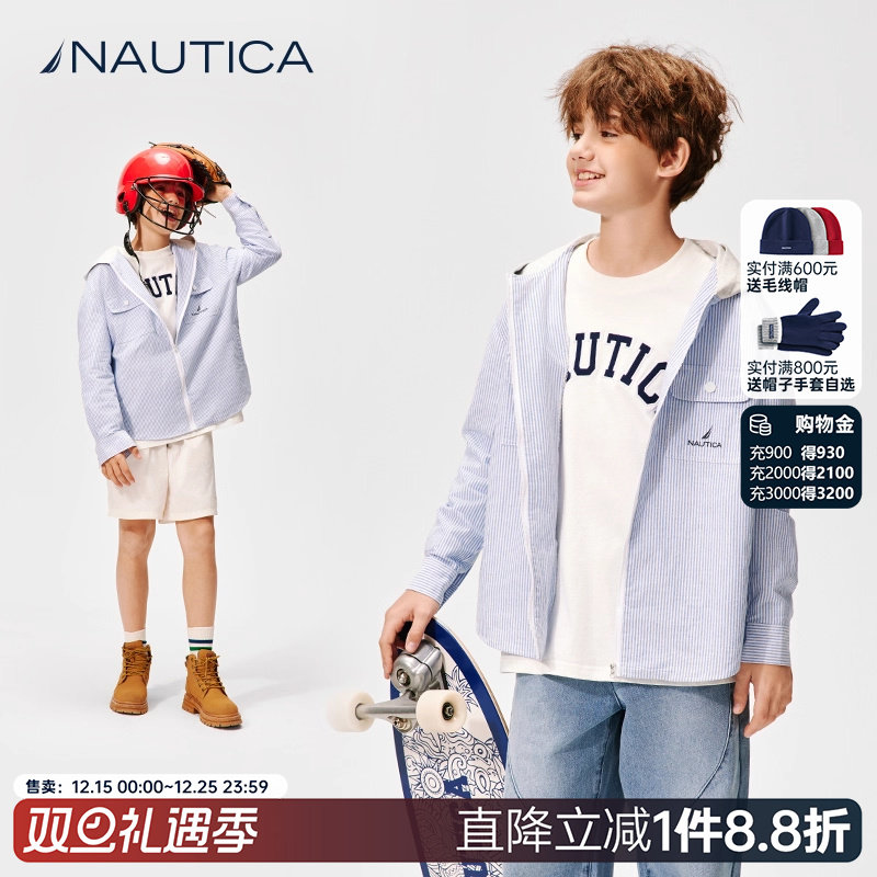 NAUTICA/诺帝卡童装 男童女童薄外套春秋季拼接连帽竖条纹衬衫
