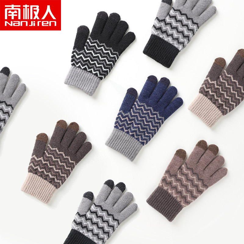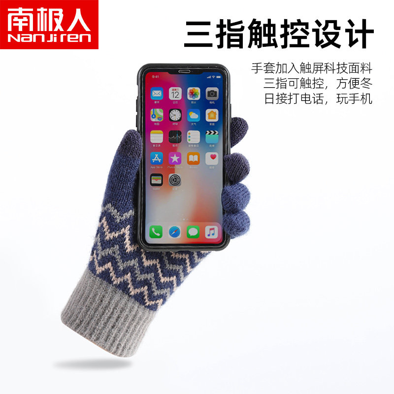 南极人保暖毛线手套男士冬季防寒加绒针织摩托厚骑行手套女触屏A