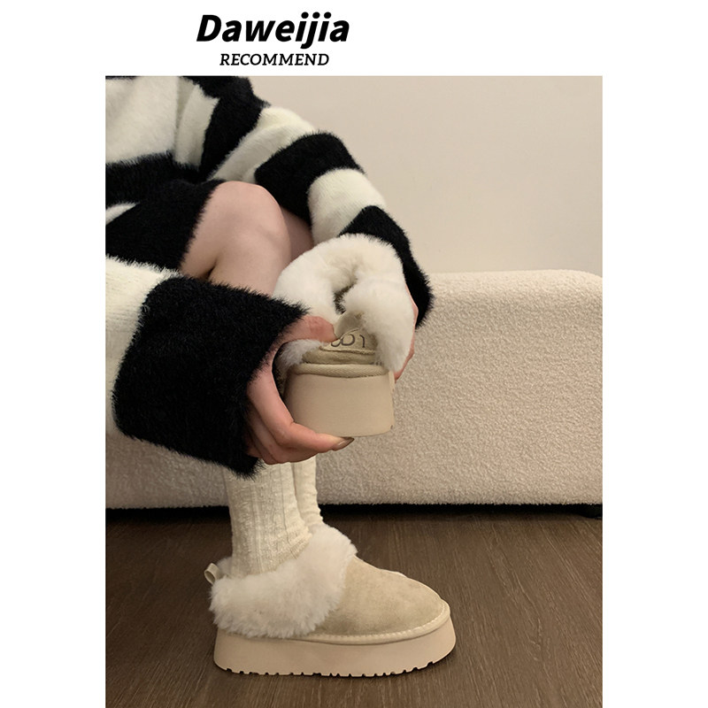 miu家厚底雪地靴女冬季真皮短靴羊毛侧拉链增高厚底加绒毛毛棉鞋