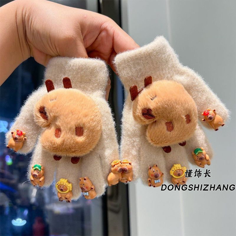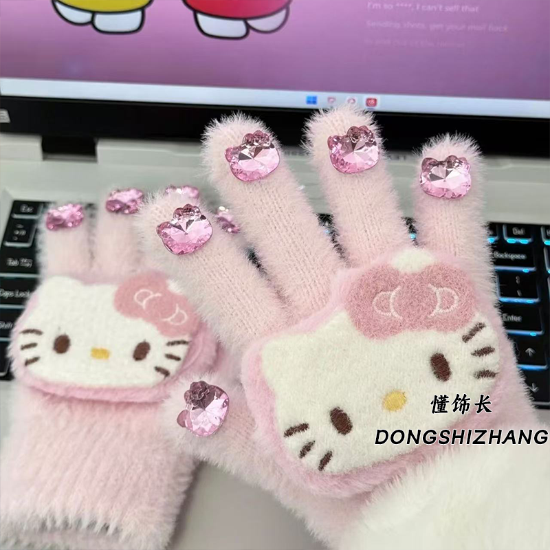 懂饰长儿童手套冬季保暖女童半指翻盖可爱学生写字美乐蒂毛线粉色