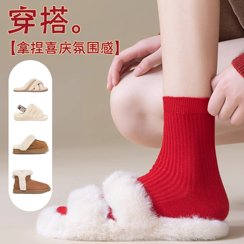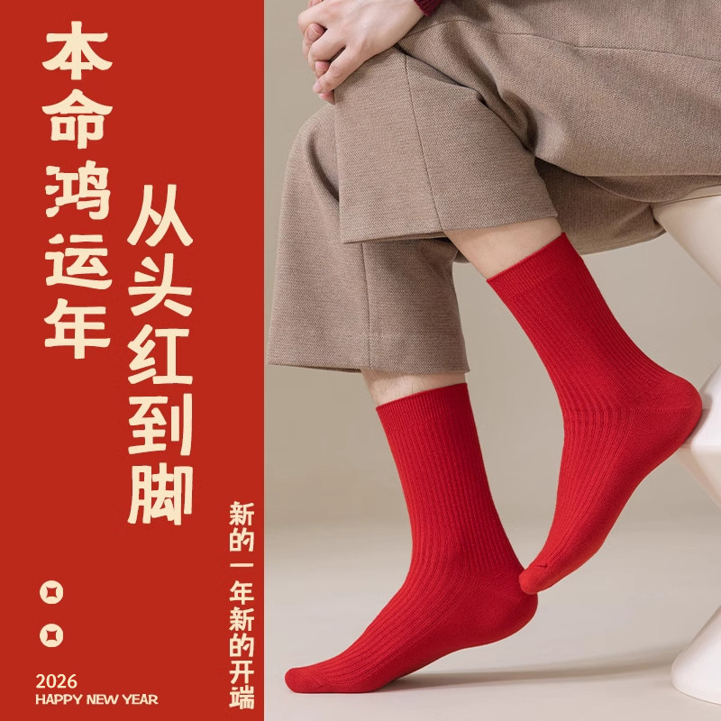 马年本命年红袜子男女同款秋冬季防臭中筒袜2026新年结婚情侣长袜