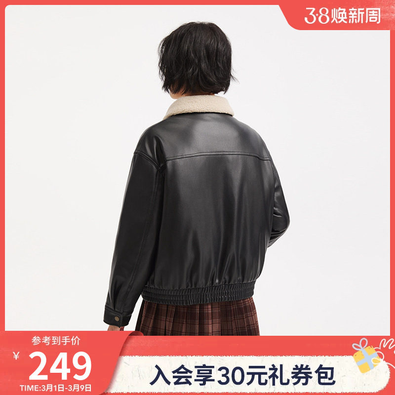 热风2025年冬季新款女士仿皮翻领外套短款经典港风