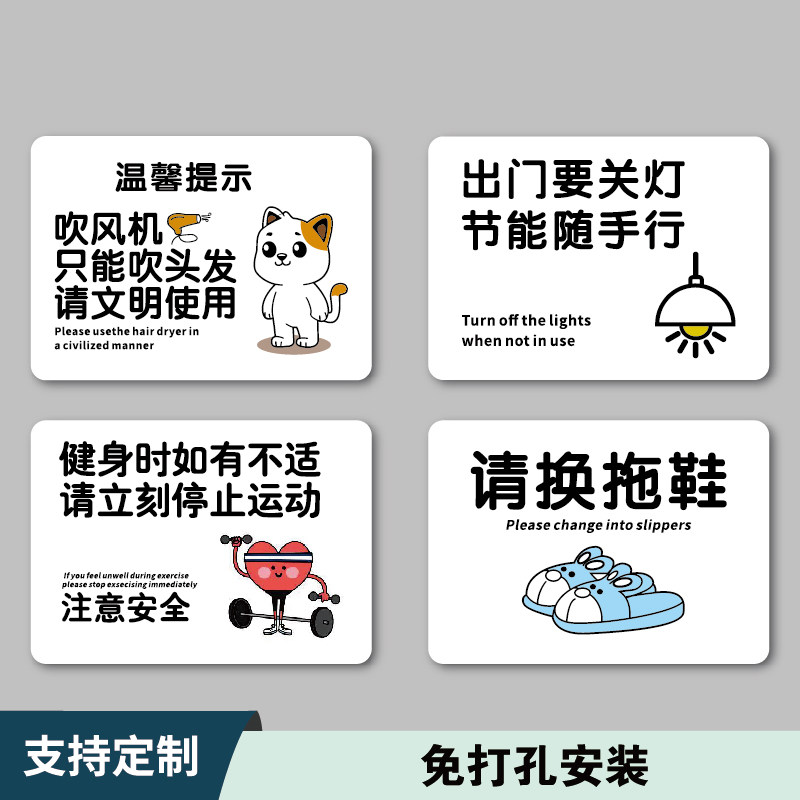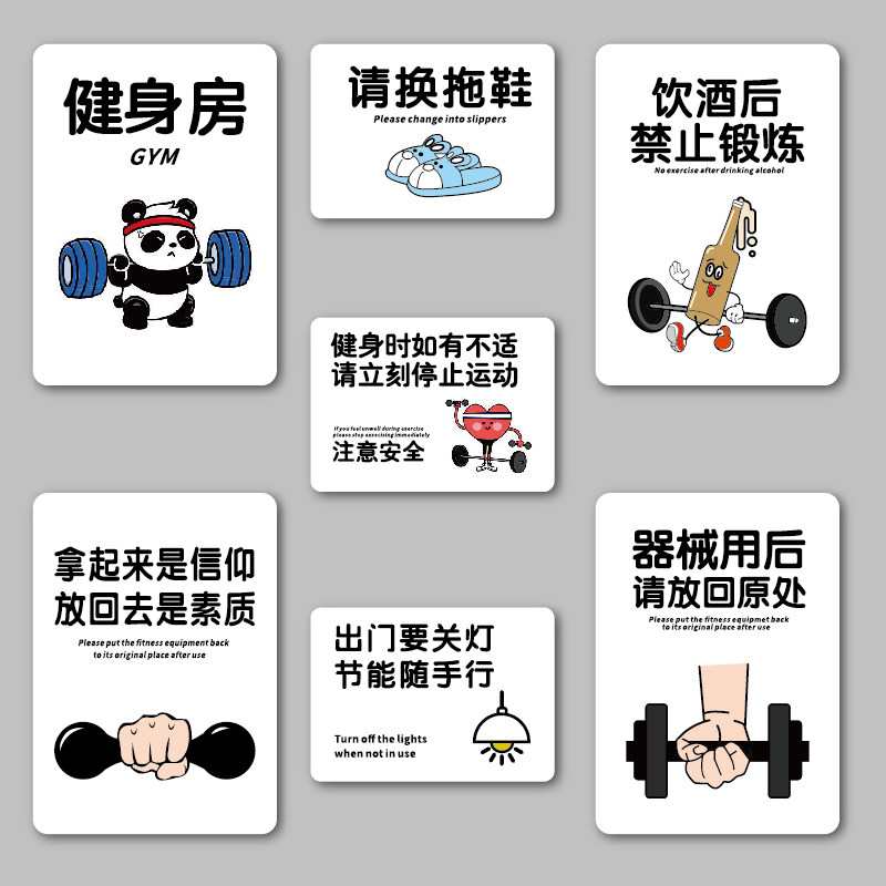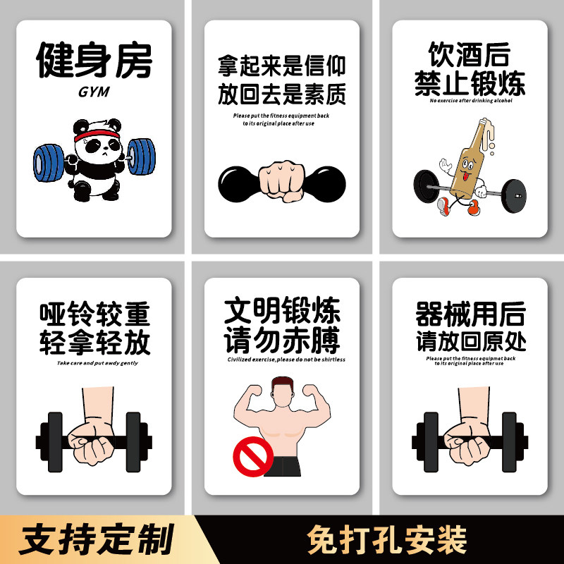 亚克力标识牌健身房哑铃杠铃轻拿轻放注意安全器械用完放回原处提示牌请勿赤膊锻炼饮酒后禁止锻炼警示牌墙贴