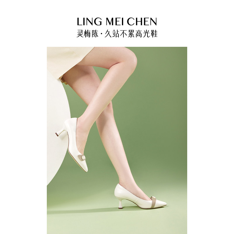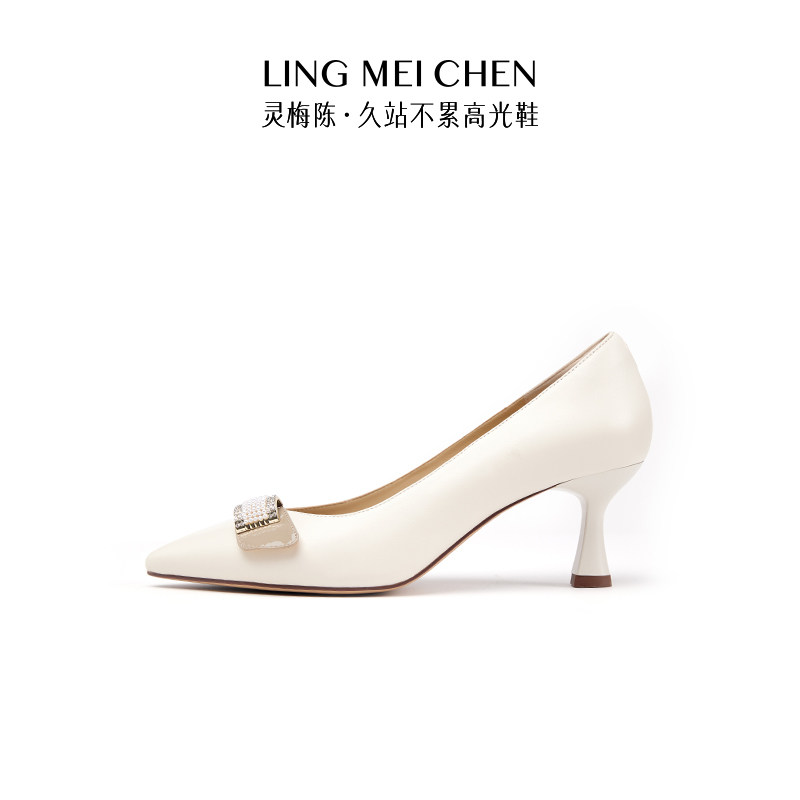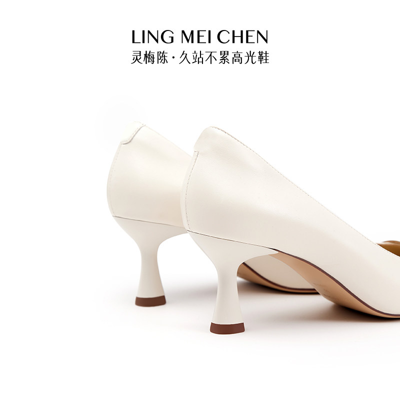 LINGMEICHEN珍珠扣白色高跟鞋秋季皮鞋女士羊皮尖头浅口单鞋女鞋