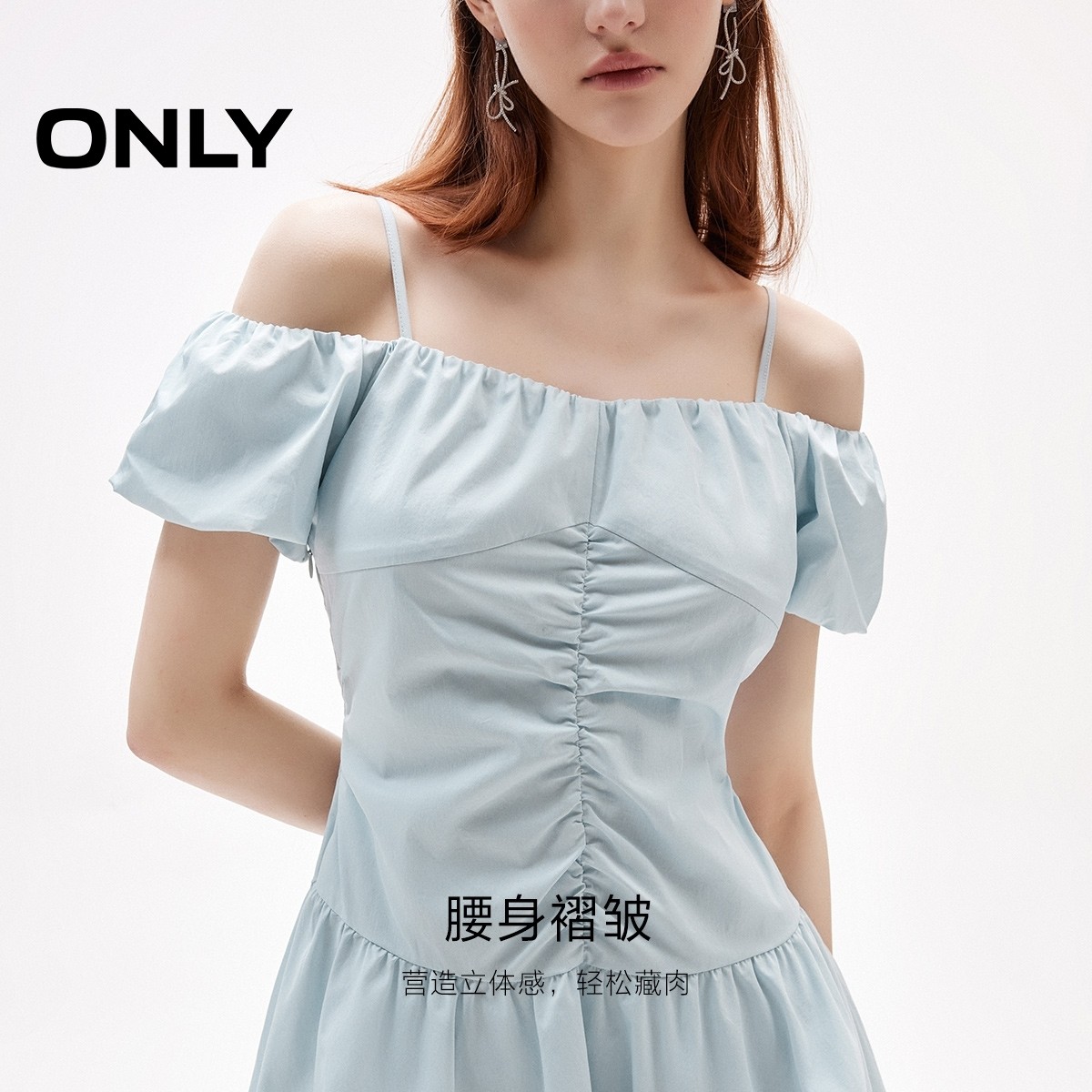 【ONLY奥莱】春季纯色拼接抽褶吊带一字肩泡泡短袖短裙连衣裙女