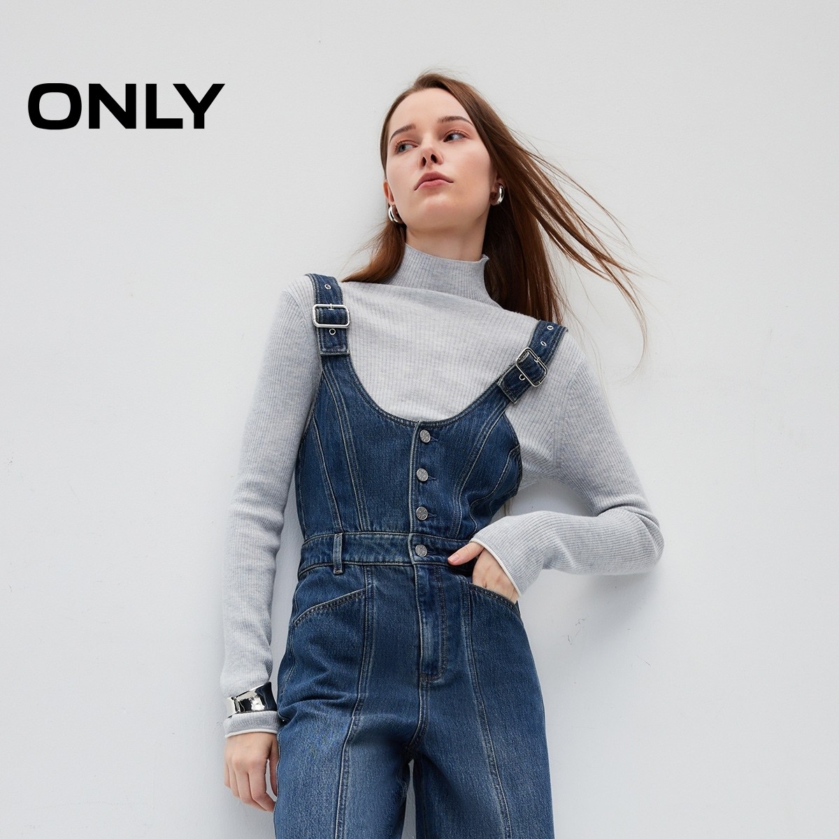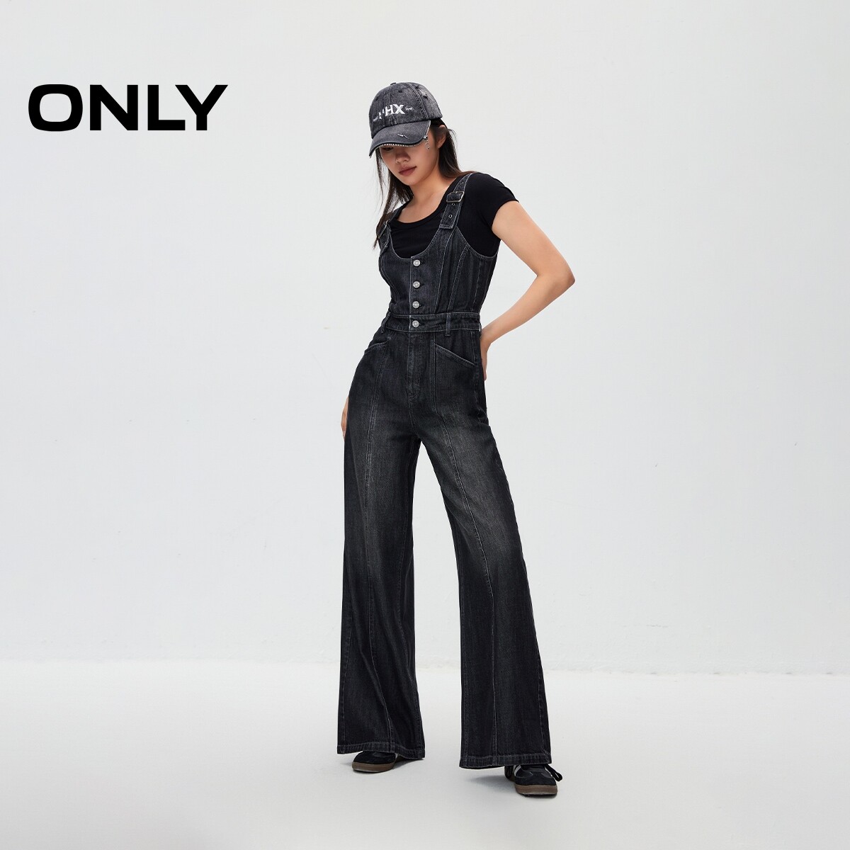 【天丝】ONLY时尚百搭莱赛尔垂坠显瘦收腰阔腿背带裤长裤牛仔裤女