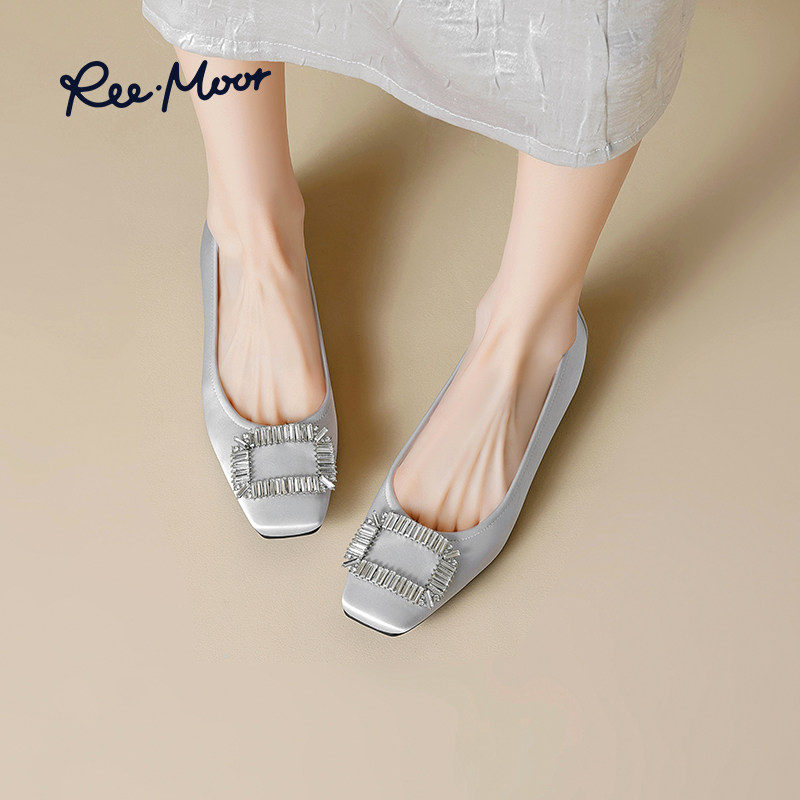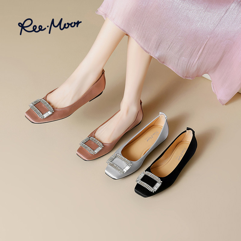 REEMOOR睿慕2025秋新款水钻方扣粗跟浅口单鞋气质平底鞋一脚蹬女