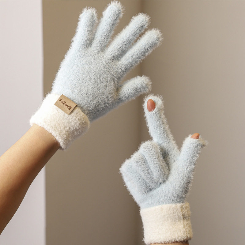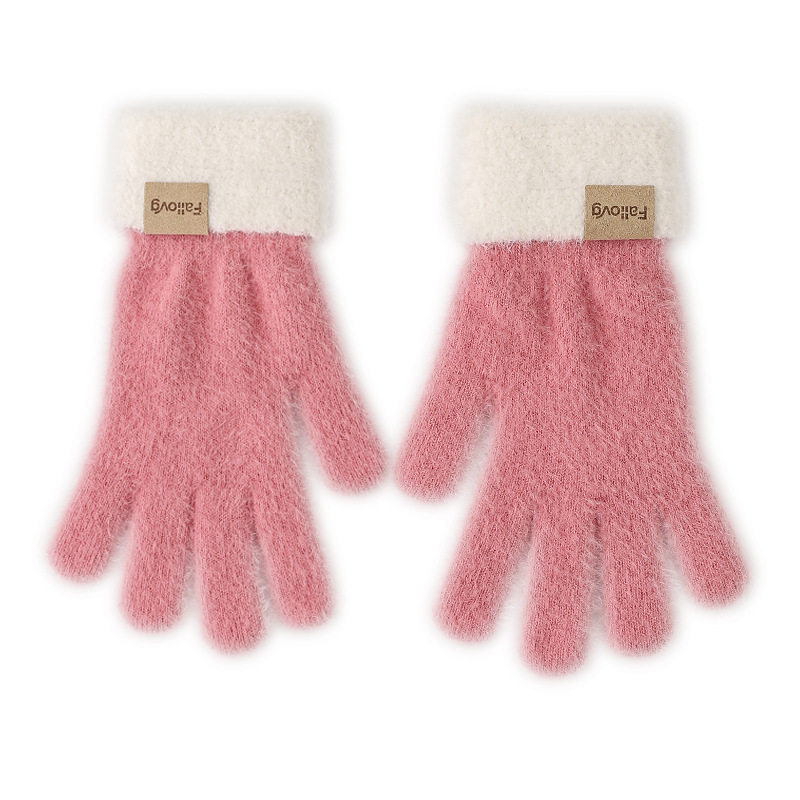 可爱针织毛绒手套冬季女款保暖拼色触屏手套分指手套学生骑行车防