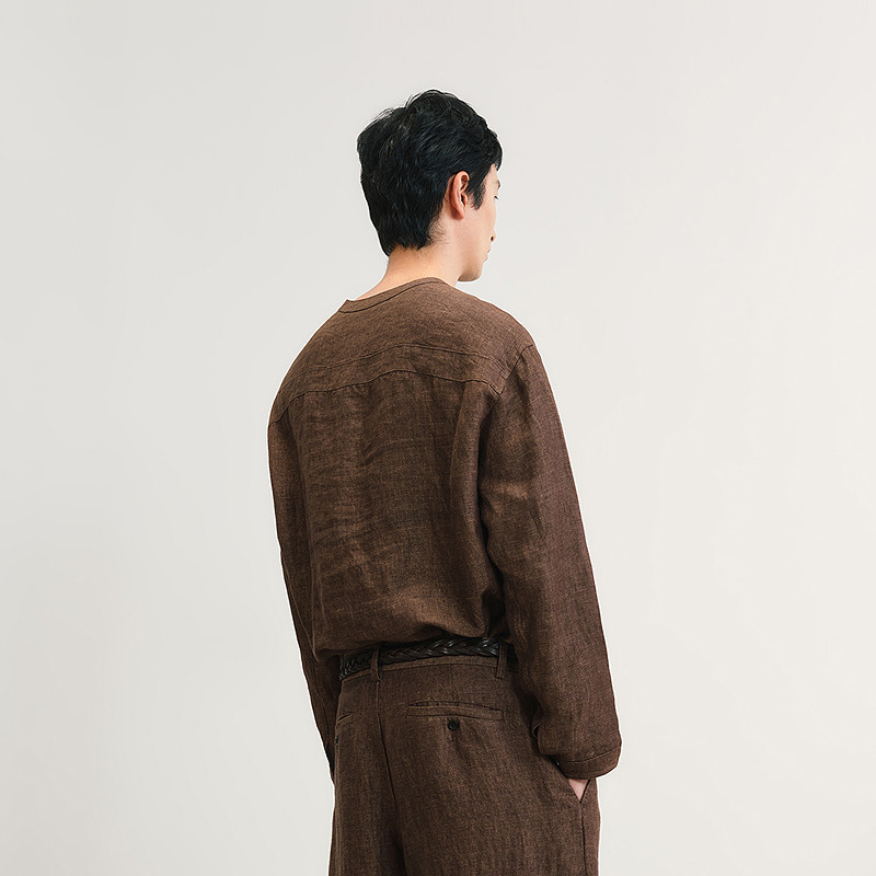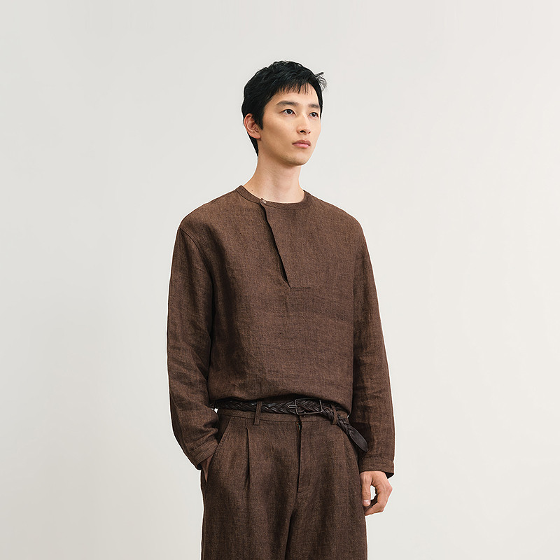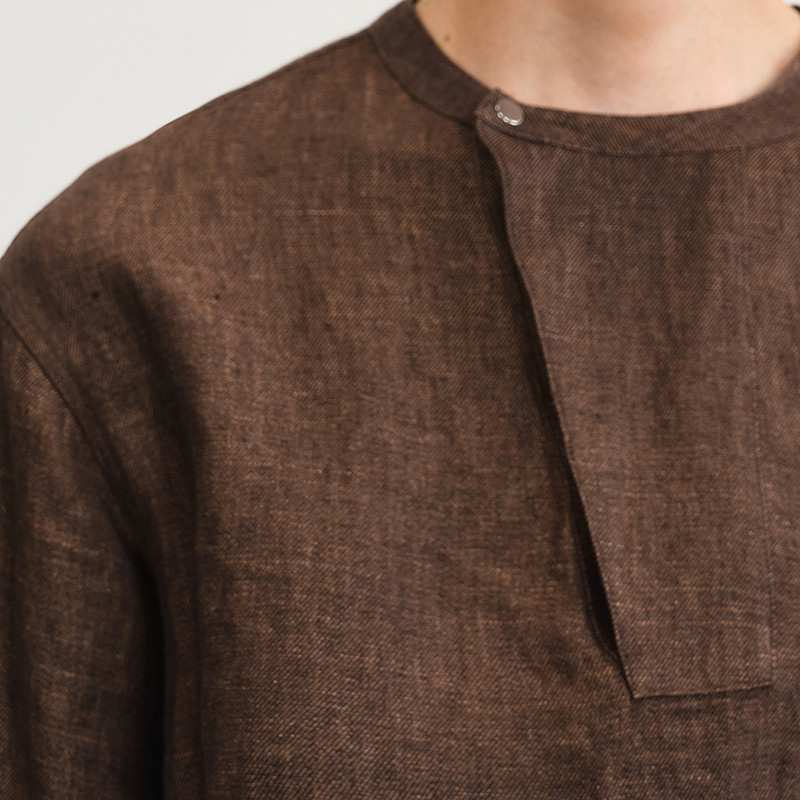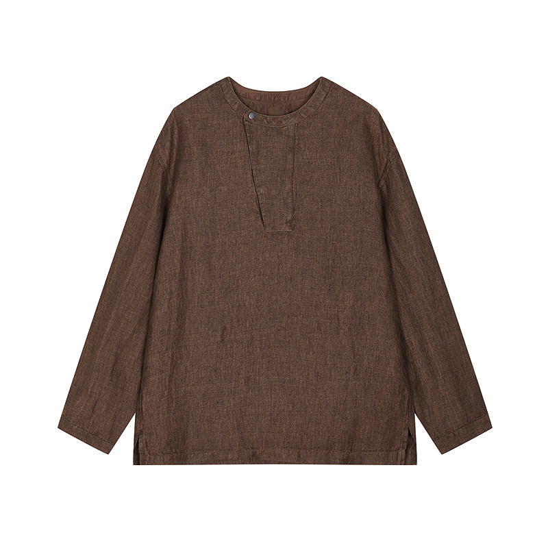 全亚麻色织斜纹布,斜门襟半开领含蓄典雅