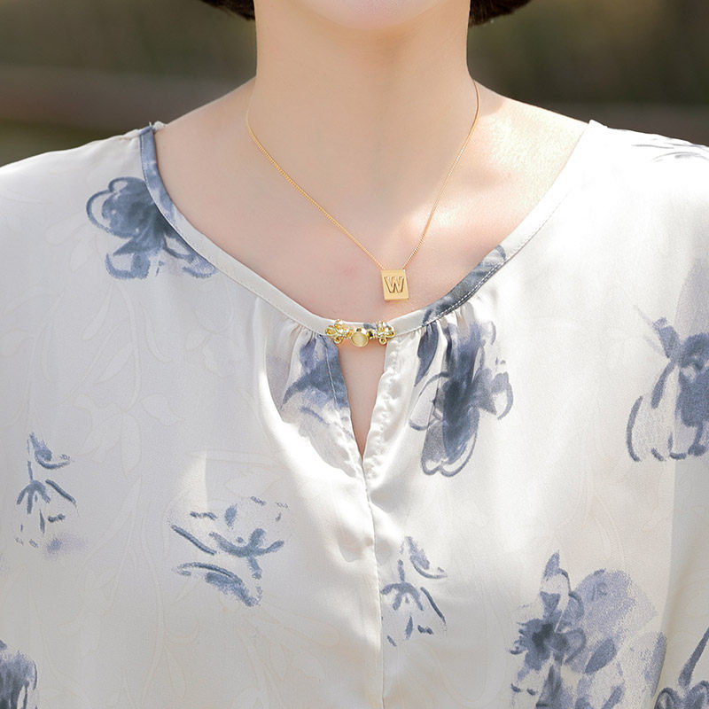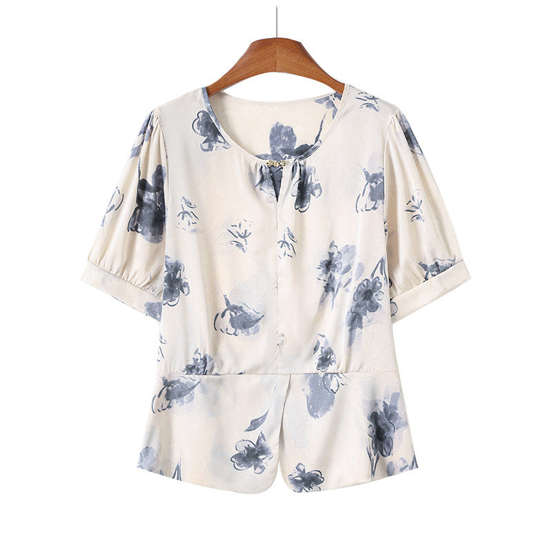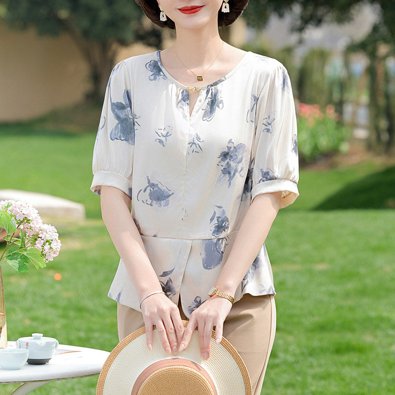恒源祥小衫短袖印花上衣薄款雪纺衫中年国风时尚妈妈装女装T恤衫