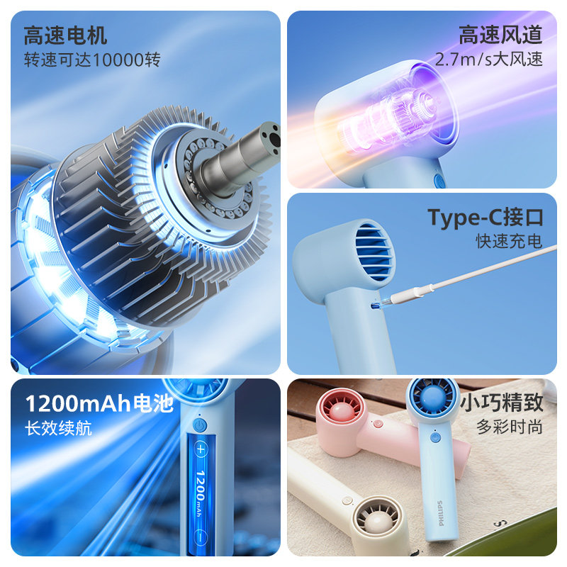 [补贴15%]飞利浦手持小型风扇超强力劲风无叶涡轮迷你便携式usb充电桌面风扇静音降温神器随身高速节能小风炮