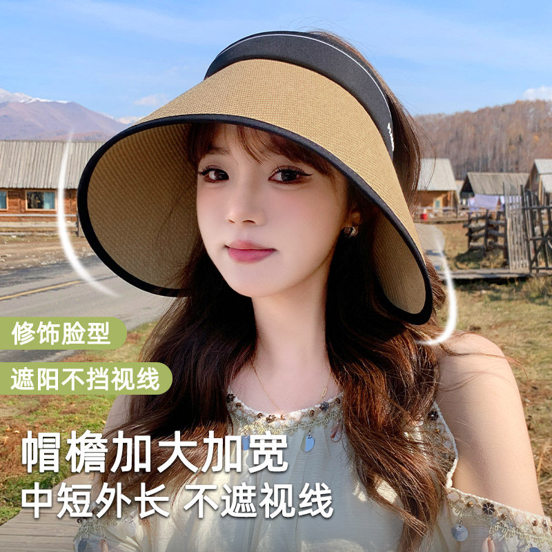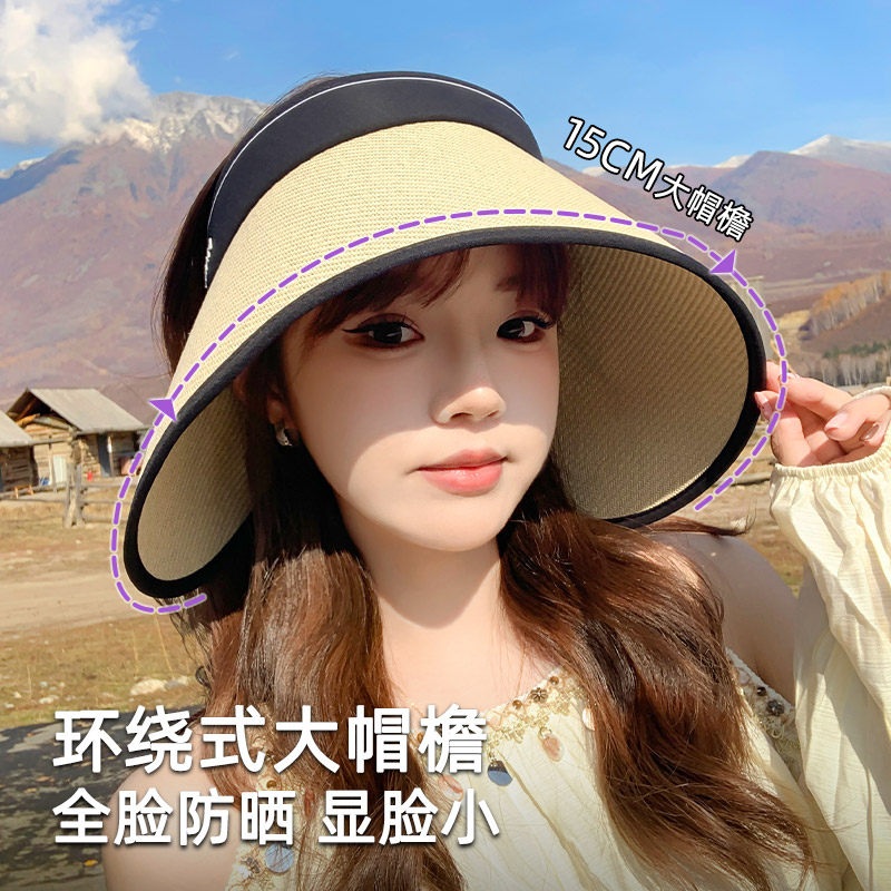 防晒帽女遮阳草帽大帽檐防紫外线草编空顶帽遮脸太阳帽海边帽子夏