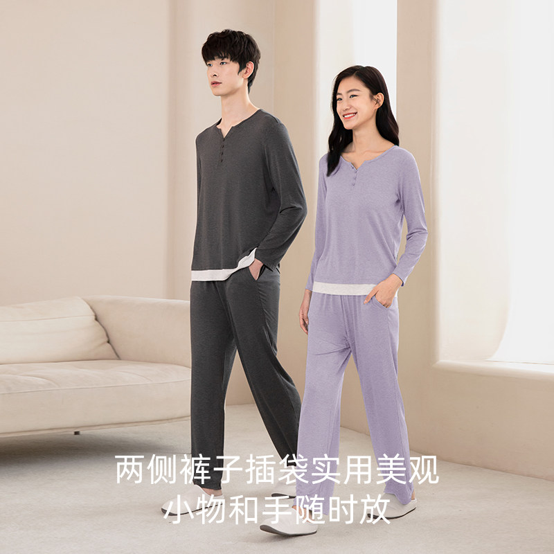 安比斯情侣睡衣舒适纯棉秋季女长袖男女同款休闲家居服套装可出门