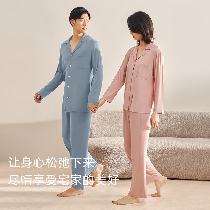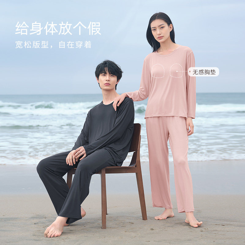 觅丝【裸感】睡衣女60S天丝莫代尔情侣家居服带胸垫长袖长裤套装