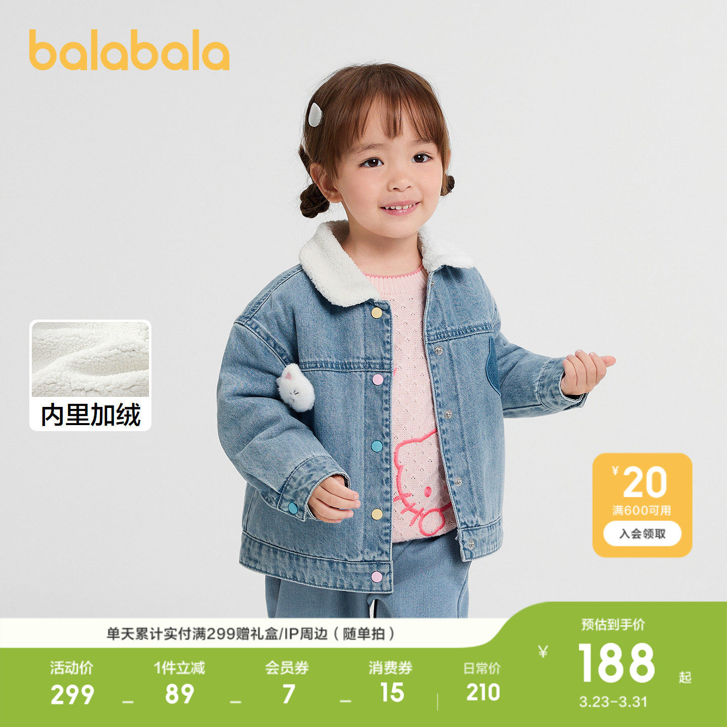 【商场同款】巴拉巴拉童装女童牛仔外套加绒秋冬衣服新款毛领上衣