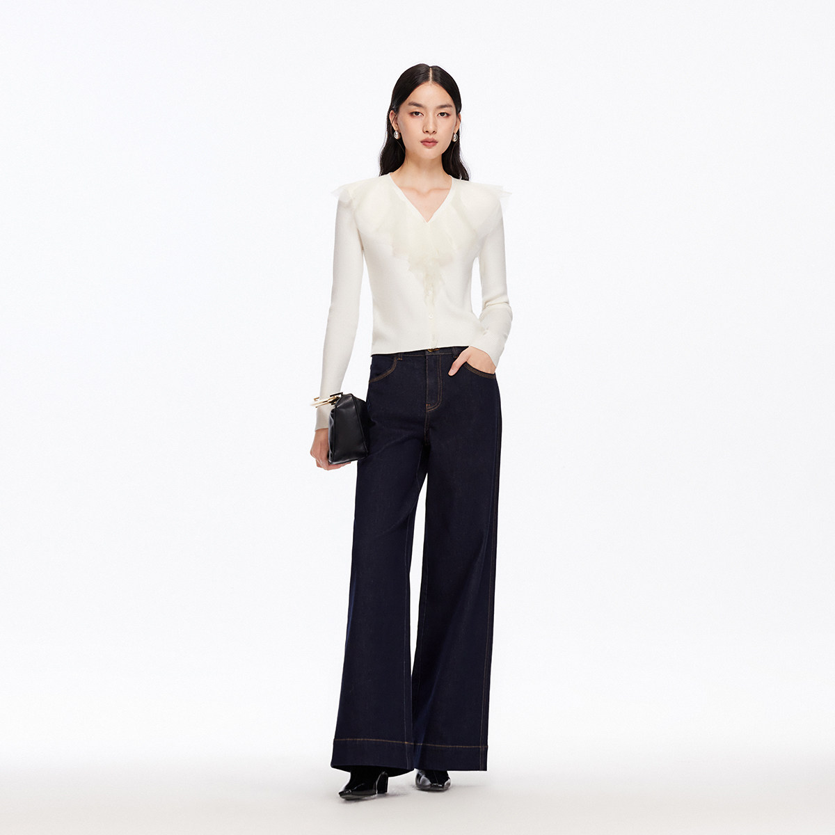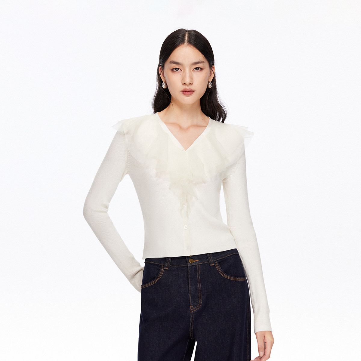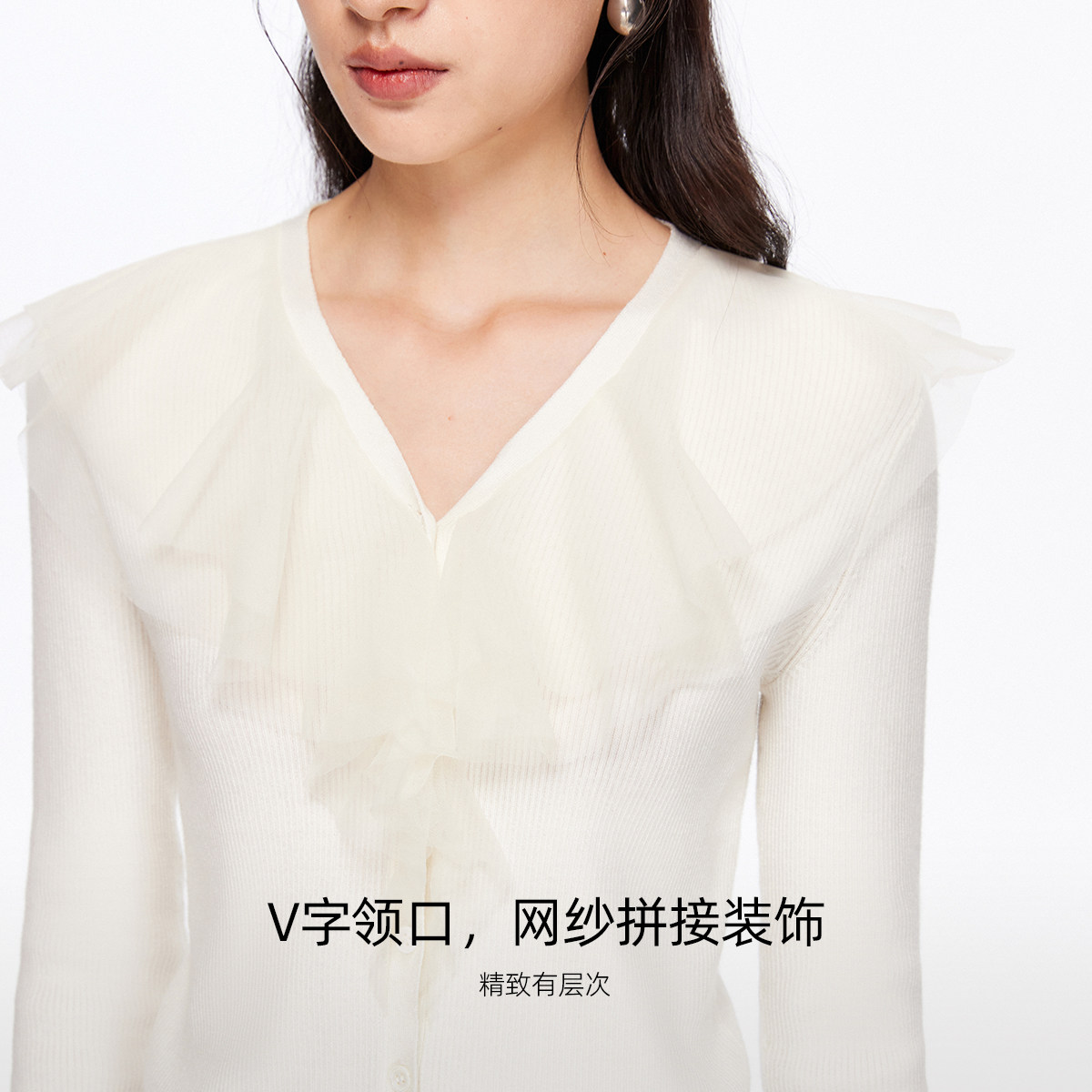 Vero Moda针织衫女25秋新款淑女风羊毛V领网纱拼接上衣325324036