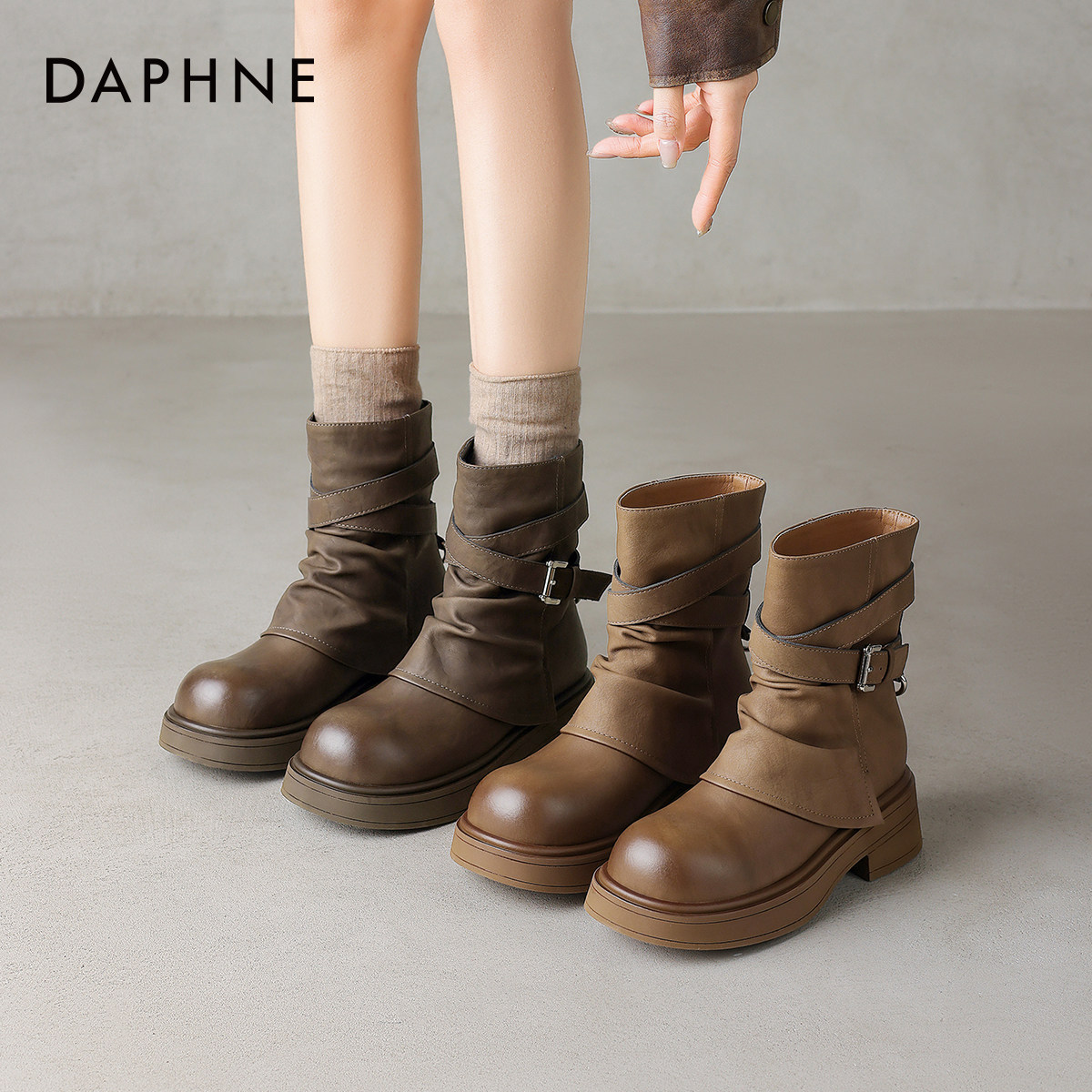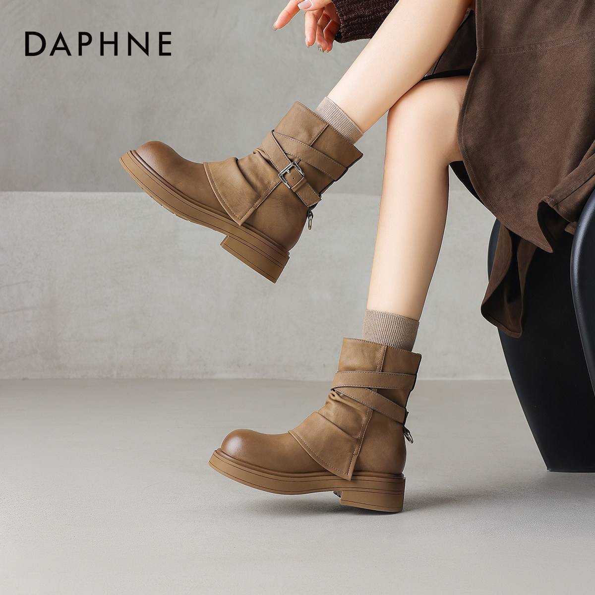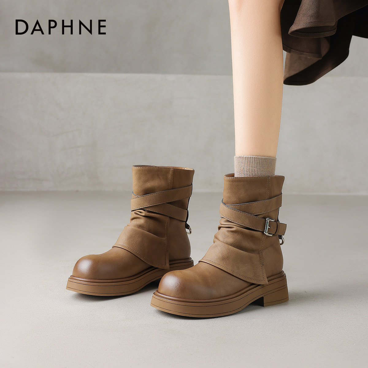 达芙妮棕色靴子短靴女2026新款冬款厚底美拉德马丁靴西部靴裤管靴