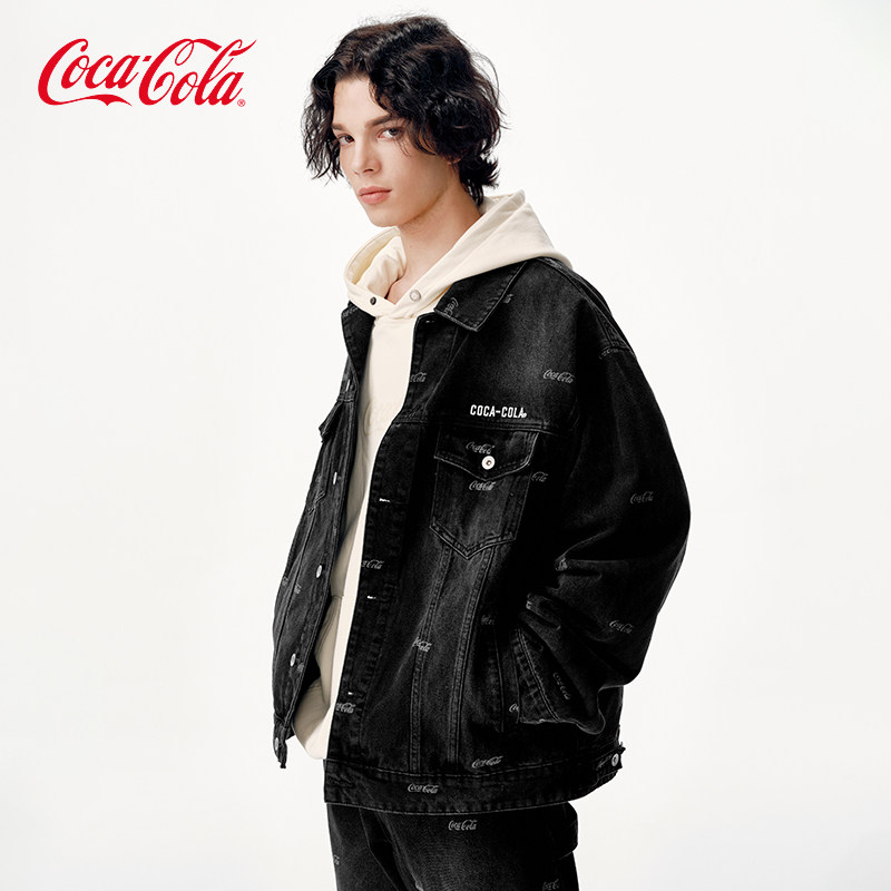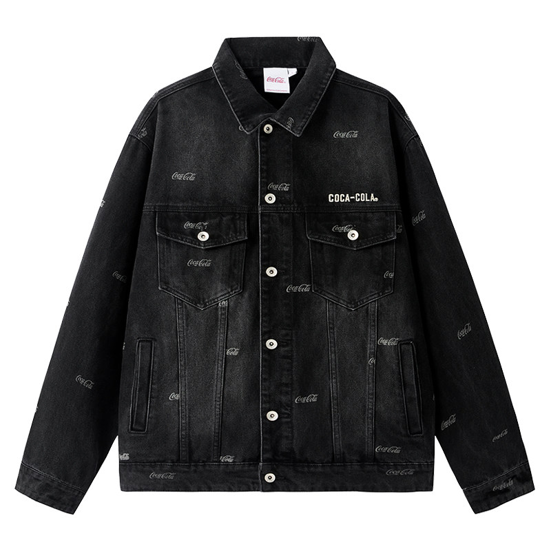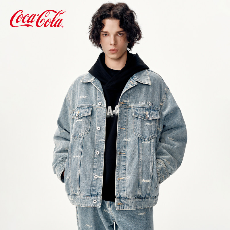 Coca-Cola/可口可乐 满印字母刺绣打褶水洗做旧休闲牛仔外套男女